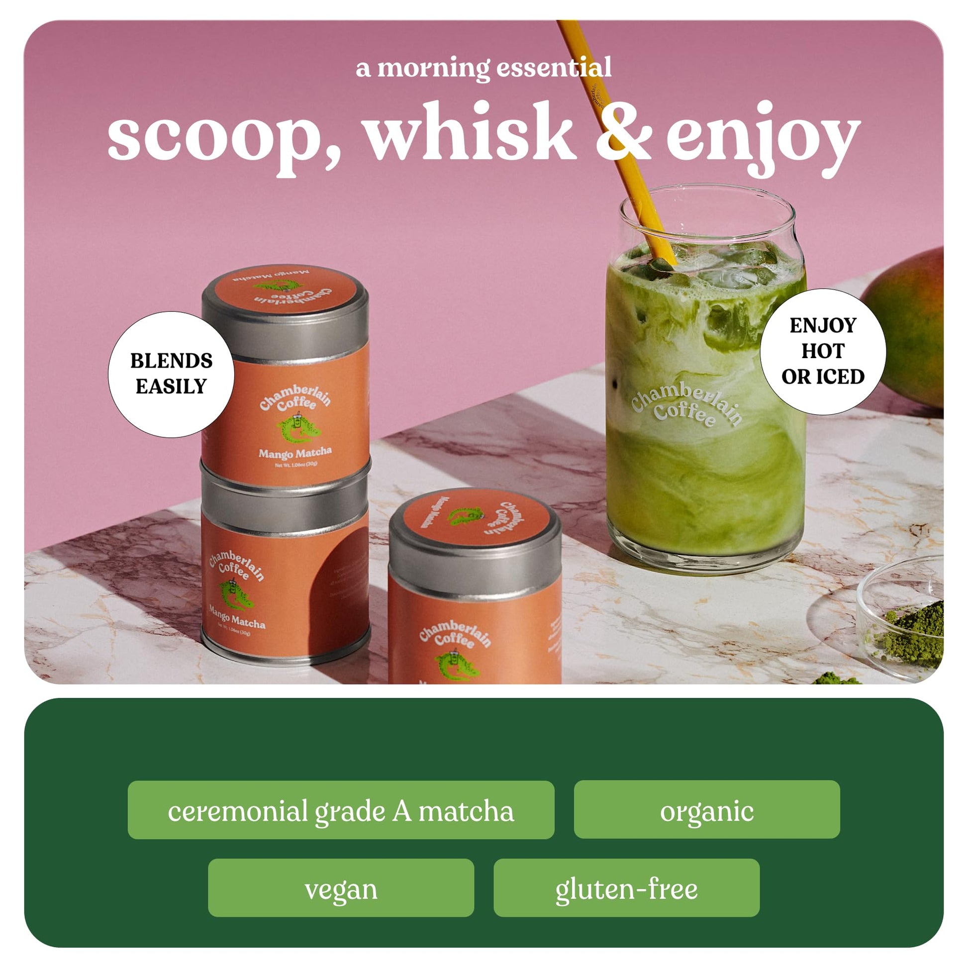 - Q: What is the size and packaging of the Chamberlain Coffee Matcha? A: The matcha comes in a convenient 1oz tin, making it easy to store and carry. Its compact size ensures you can take it on the go for a quick energy boost.
