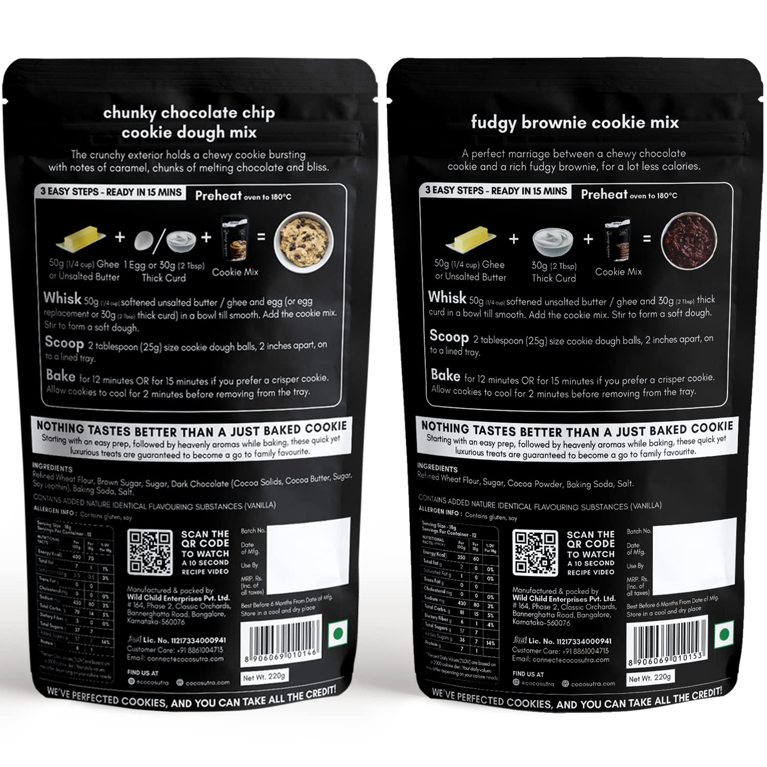 - Q: What flavors are included in the COCOSUTRA Cookie Dough Mix Combo Pack? A: The COCOSUTRA Cookie Dough Mix Combo Pack includes two delicious flavors: Chunky Chocolate Chip and Fudgy Brownie, with each flavor packed in a 220 g pack. Each pack makes 12 cookies, totaling 24 cookies in the combo.