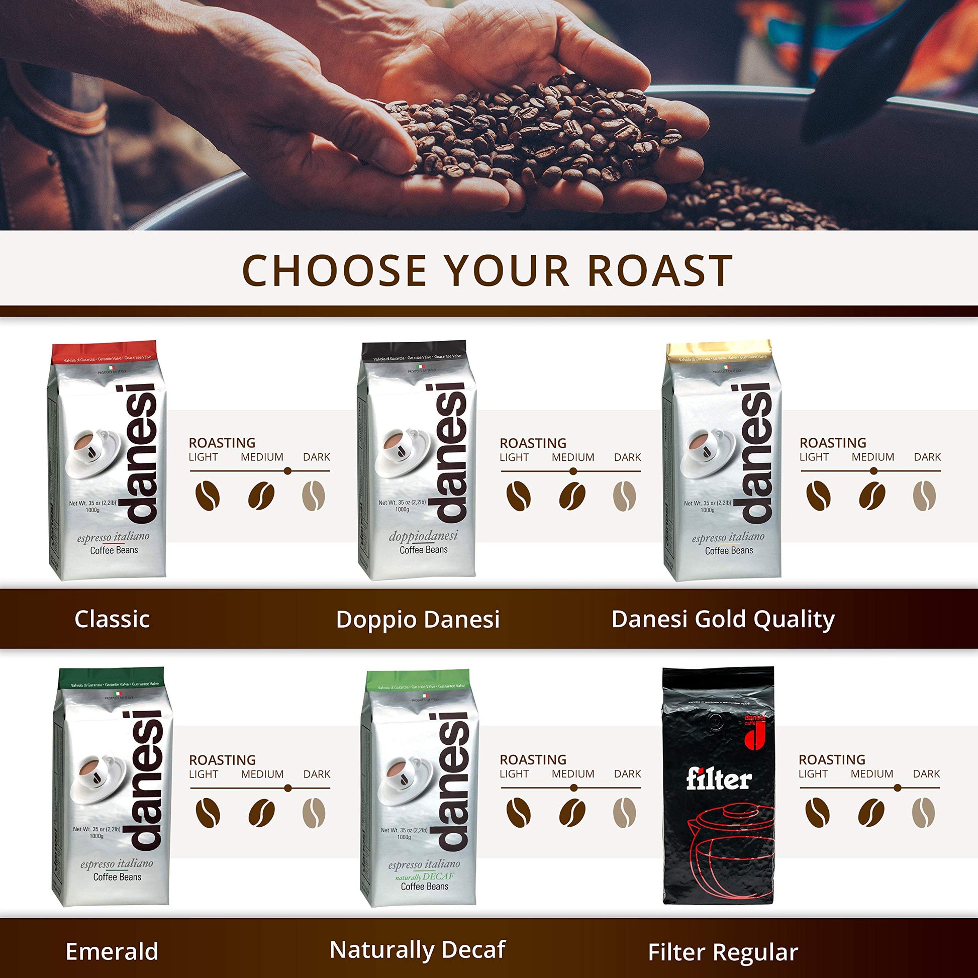 - Q: What type of coffee beans does Danesi Caffe offer? A: Danesi Caffe offers whole roasted coffee beans, specifically designed for espresso. The beans are a medium roast and are made from 100% premium quality Arabica coffee beans, ensuring a rich and balanced flavor.
