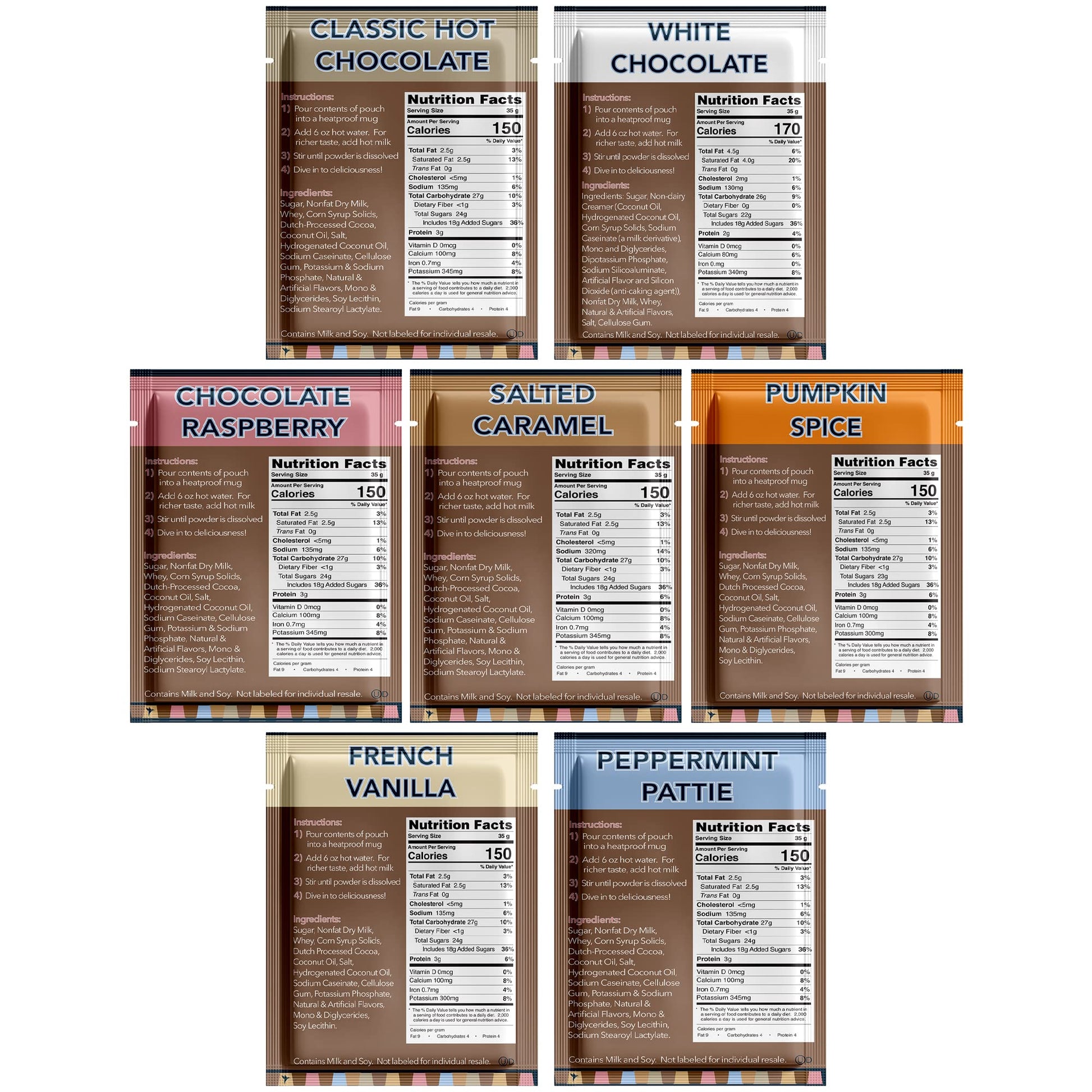 Q: What flavors are included in the Double Donut Hot Chocolate Variety Pack?A: The Double Donut Hot Chocolate Variety Pack includes four delicious flavors: Classic Chocolate, Chocolate Raspberry, Salted Caramel, and Peppermint. Each flavor is designed to provide a unique and enjoyable hot chocolate experience.