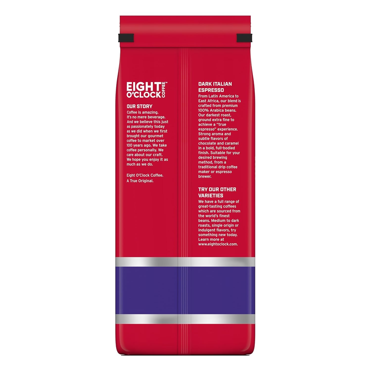 Q: What type of coffee beans are used in Eighth-OClock Coffee Dark Italian Espresso?A: Eighth-OClock Coffee Dark Italian Espresso is crafted from premium 100% Arabica coffee beans sourced from regions including Latin America and East Africa.