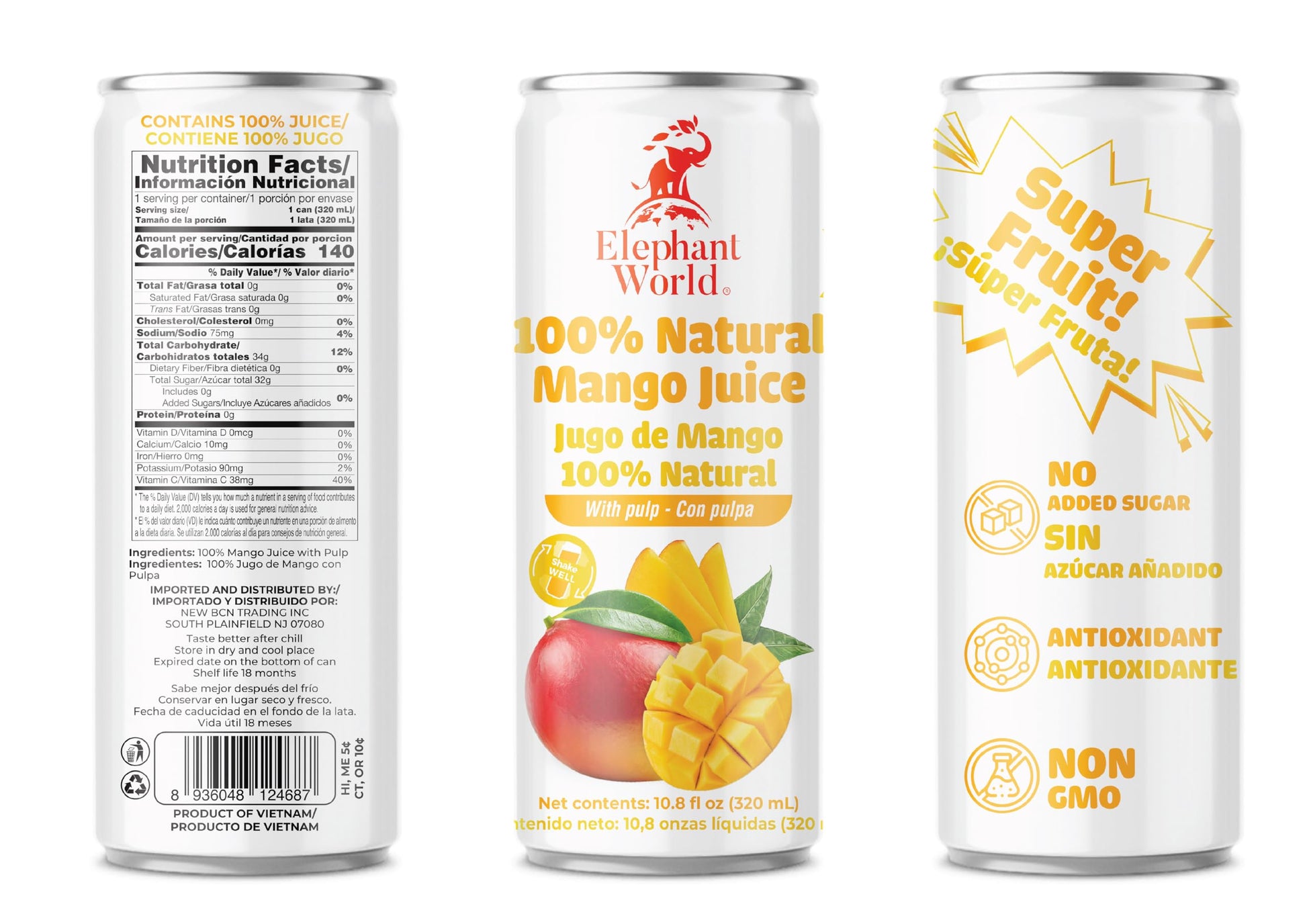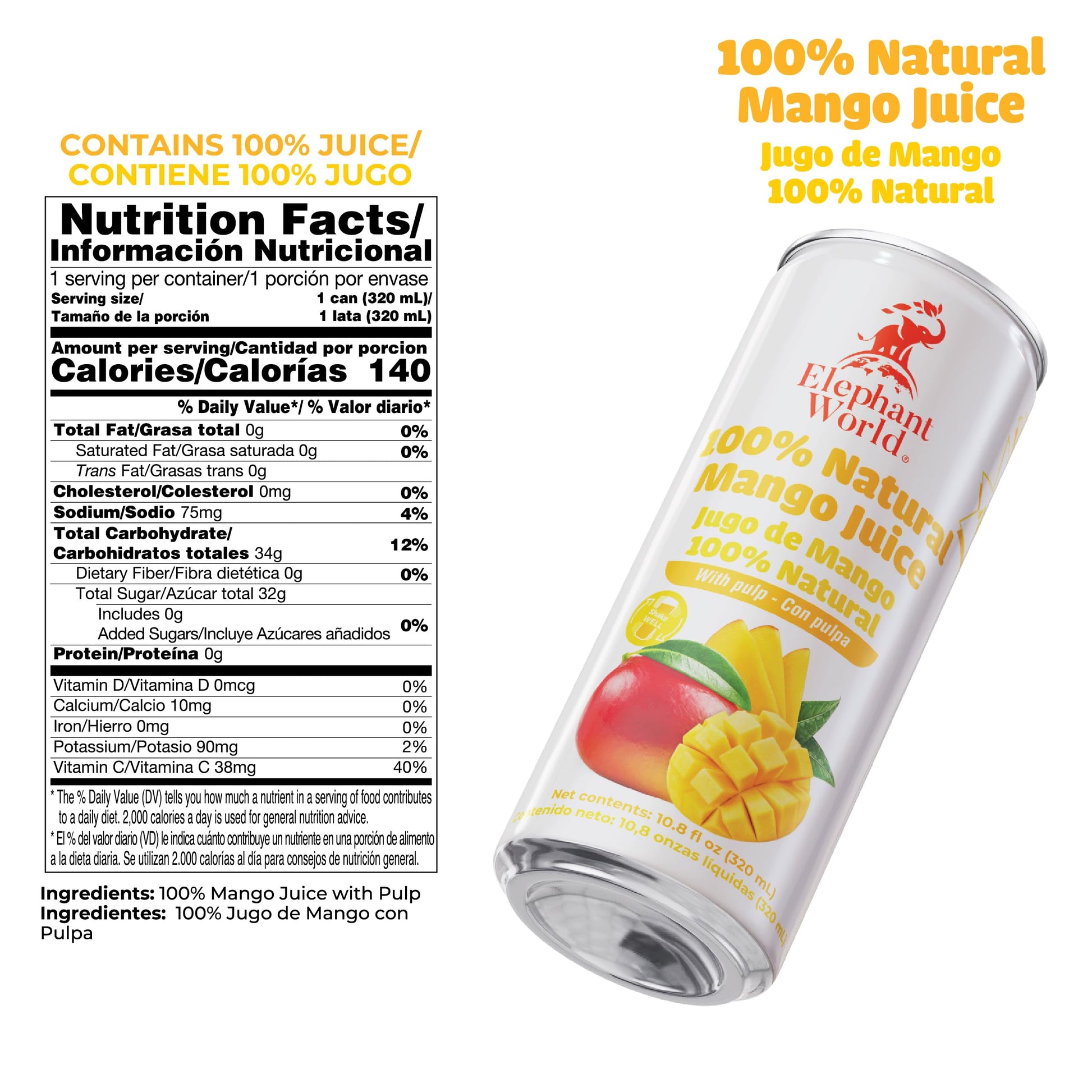 Q: What is the packaging size of Elephant World Mango Juice?A: Elephant World Mango Juice comes in a pack of 12, with each bottle containing 10.82 fluid ounces (320 ml).