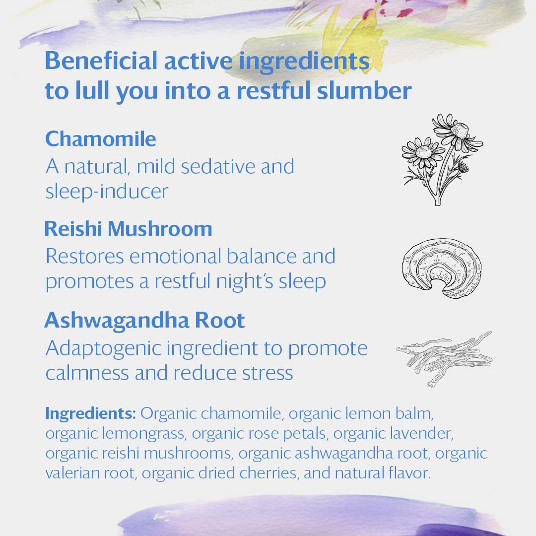 - Q: What are the main ingredients in Grace Farms REST Wellness Organic Tea Blend? A: The main ingredients in the Grace Farms REST Wellness Organic Tea Blend include Egyptian chamomile, soothing vanilla, ashwagandha root, reishi mushrooms, and other adaptogenic herbs and flowers. This combination is designed to promote relaxation and support restful sleep.
