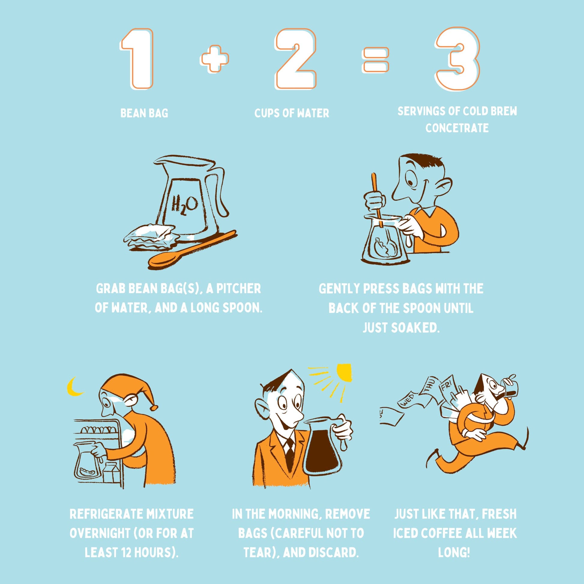 Q: How do I prepare Grady's Cold Brew Coffee Pouches?A: To prepare Grady's Cold Brew, simply steep the bean bags in cold water for at least 12 hours, but no more than 24 hours. Once steeped, remove the bags, and your cold brew concentrate is ready to enjoy.