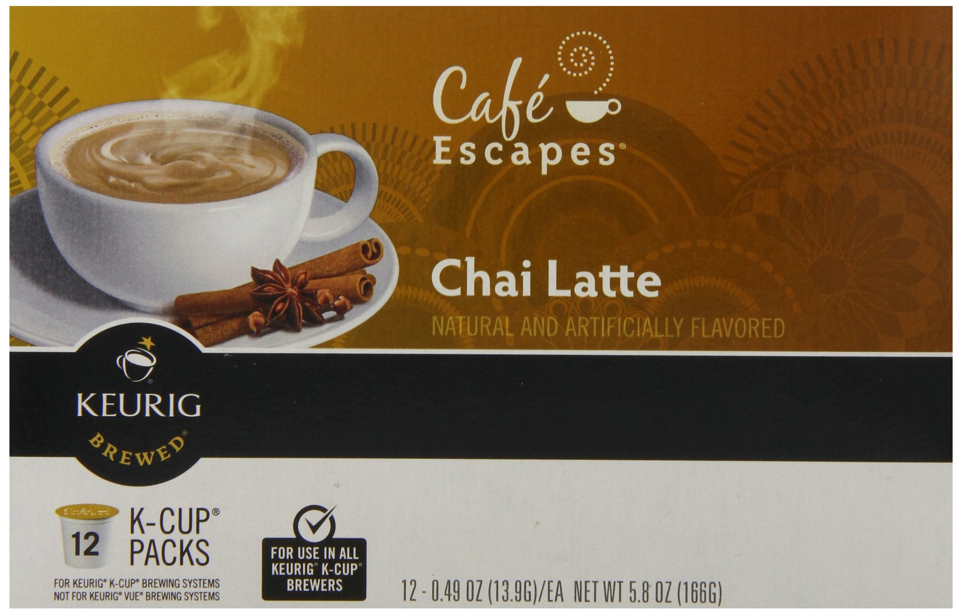 Includes Cafe Escapes Chai Latte K-Cups, 12 Count (Packaging May Vary). To Prevent Dripping After Brewing, Tilt K-Cup Slightly When You Remove It From Brewer.Please Note The Packaging Change: Due To A Recent Packaging Change, The Graphical Design Of The K-Cup Lids May Vary Slightly From Image. The Product Ingredients, Roast, Amount Of Grinds, Etc. Have Not Changed And Are Exactly The Same As This Product Has Always Been.