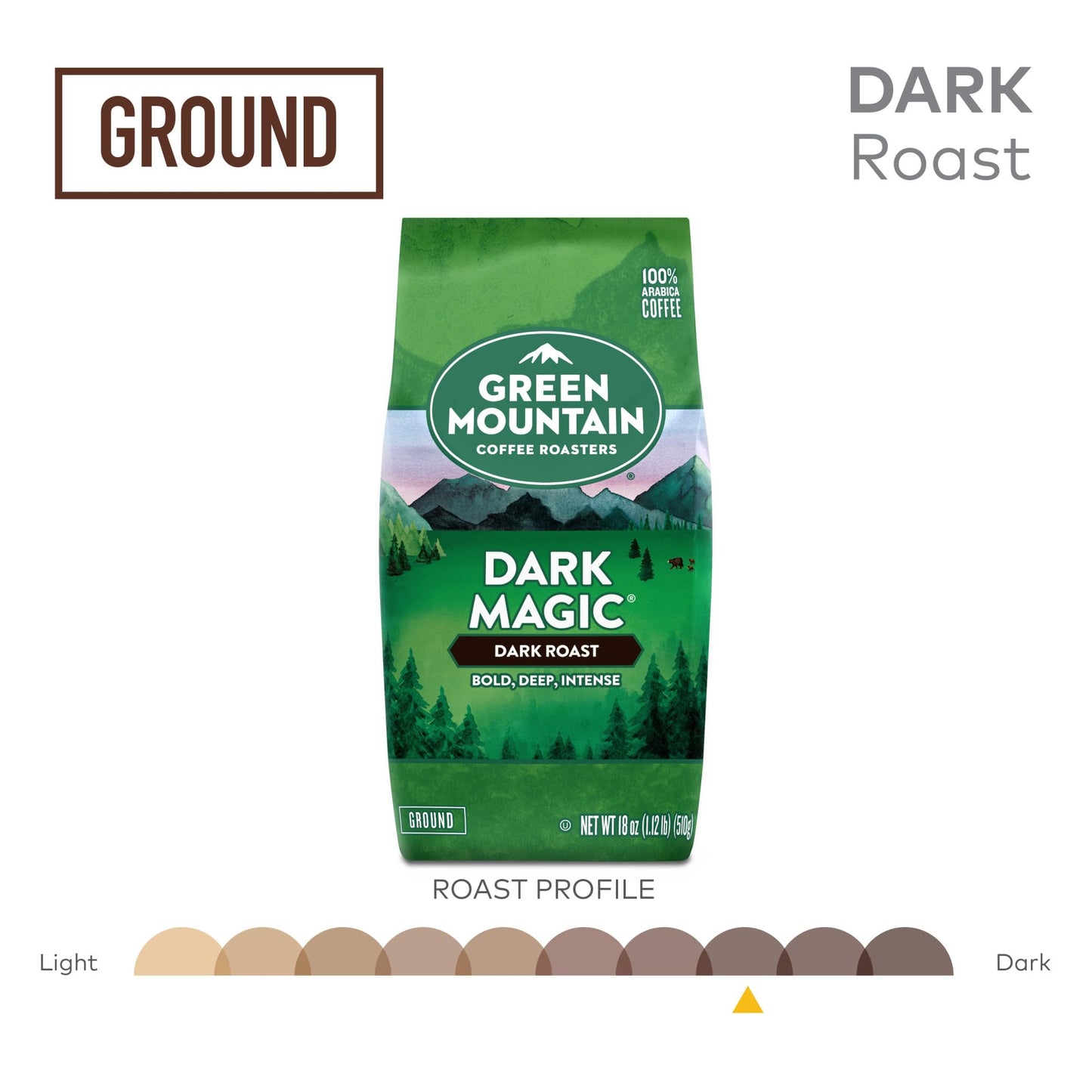 - Q: What makes Green Mountain Coffee Roasters Dark Magic unique? A: Green Mountain Coffee Roasters Dark Magic is distinguished by its deep and intense flavor profile, featuring notes of dried fruit and chocolate. This bold blend is crafted from 100% Arabica coffee, ensuring a high-quality cup with a subtly sweet finish.