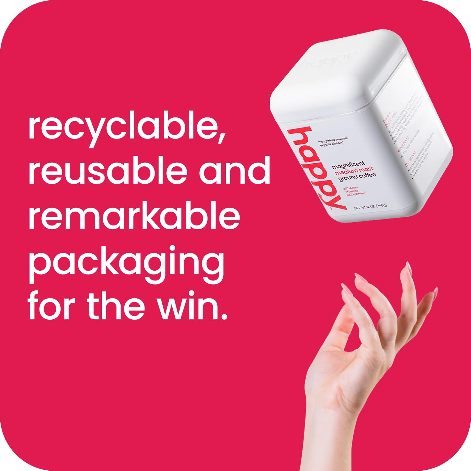 Q: Is Happy Coffee environmentally friendly?A: Yes, Happy Coffee is committed to sustainability. The coffee comes in recyclable and refillable containers, and it is Raíz Sustainability Verified, ensuring environmentally responsible sourcing and production.