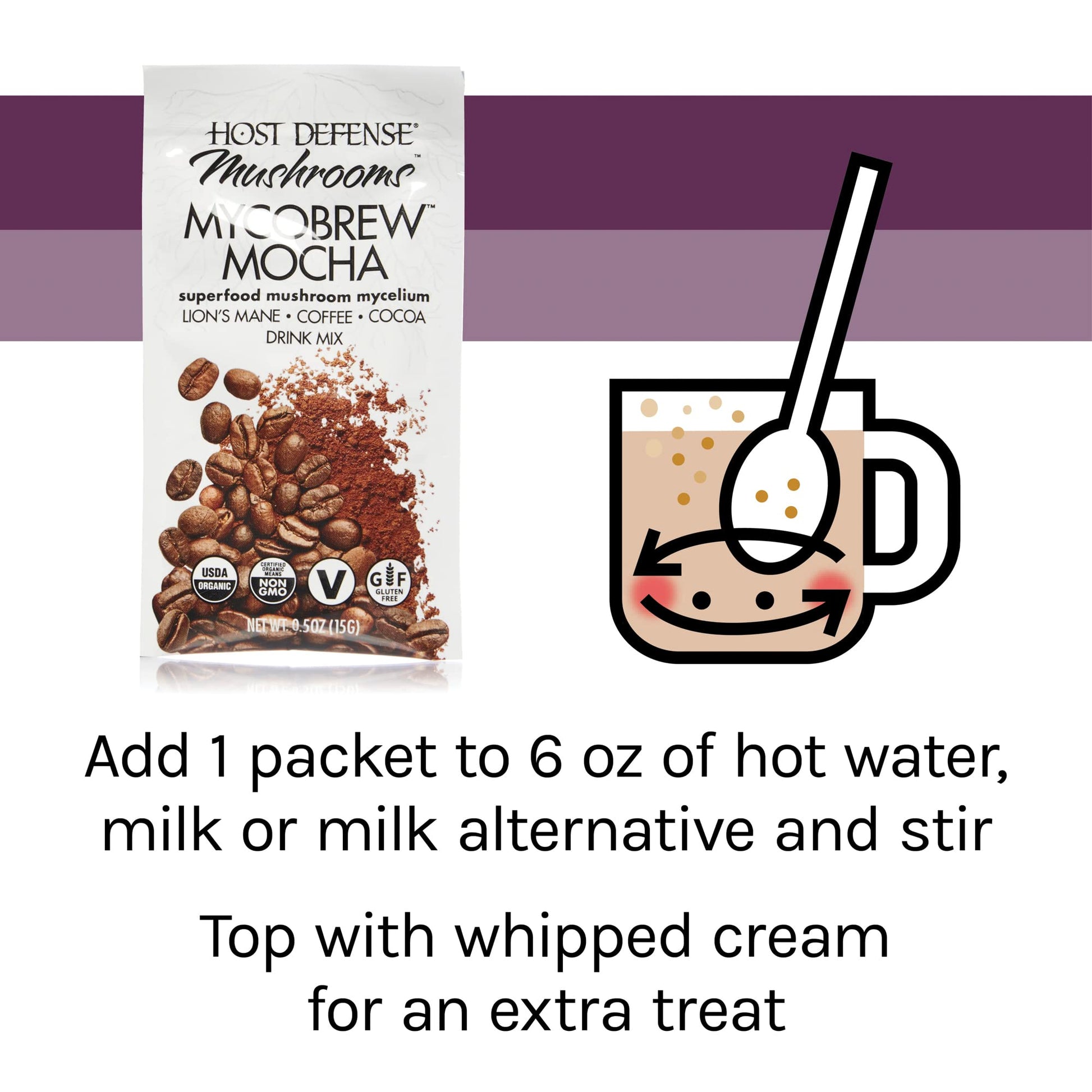Q: How do I prepare Host Defense MycoBrew Mocha Drink Mix?A: To prepare, simply stir 1 tablespoon or 1 packet of the drink mix into 6 oz of hot water, milk, or a milk alternative. For an iced mocha, dissolve in hot liquid, then stir, shake, or blend with ice.