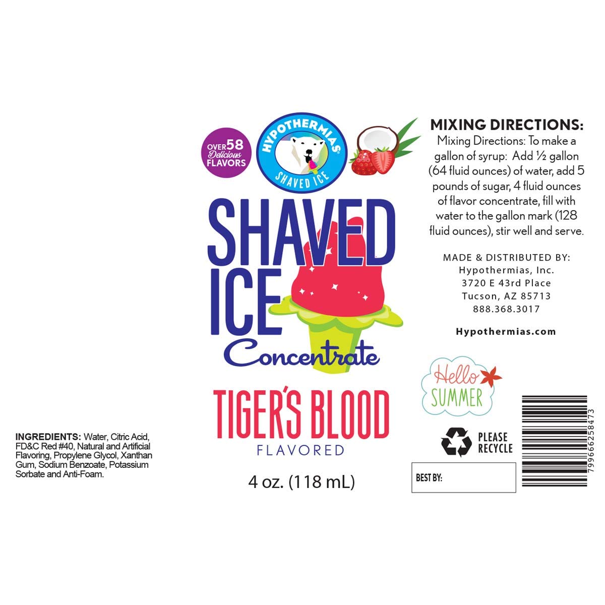 Delicious Tiger'S Blood Shaved Ice Or Snow Cone Unsweetened Flavor Concentrate. Each 4 Ounces Of Concentrate Will Make 1 Gallon Of Syrup When Mixed. This Is Professional, True To Taste Shaved Ice Flavor. Mixing Directions- To Make A Gallon Of Syrup: Use Four Ounces Of Flavor Concentrate (Shake Well) With Five Pounds Of Sugar, Fill With Water (Approximately 1/2 Gallon Of Water) To The Gallon Mark And Stir Well.Preservatives Optional. Life Of Concentrate Is Two To Three Years. To Extend The Life Of The Syrups You Can Add Optional Preservatives (Citric Acid, Sodium Benzoate). Please Keep At Room Temperature And Out Of Direct Sunlight And Heat.Made In The Usa.*** A Note About The Flavor Concentrates, It Is Extremely Important To Follow The Directions Very Carefully When Making Flavors From The Concentrates. This Is A Flavoring Concentrate, Not A Ready To Use Syrup. You Have To Add Sweetener And Water To The Concentrate To Create The Syrup To Be Used On The Ice. Without The Sweetener, It Will Not Be Sweet. A Concentrate Allows You To Choose The Type And Sweetness Level Of The Syrup. You Can Use Pure Cane Sugar, High Fructose Corn Syrup Or Alternative Sweeteners. Consider Hypothermias' Ready To Use Flavor Line If You Are Looking For A A Pre-Sweetened Shaved Ice Or Sno-Cone Syrup. Must Add Water And Sugar Or Sweetner For Syrup To Be Ready To Use. Each 4 Ounce Bottle Makes 1 Gallon Of Syrup When Mixed.
