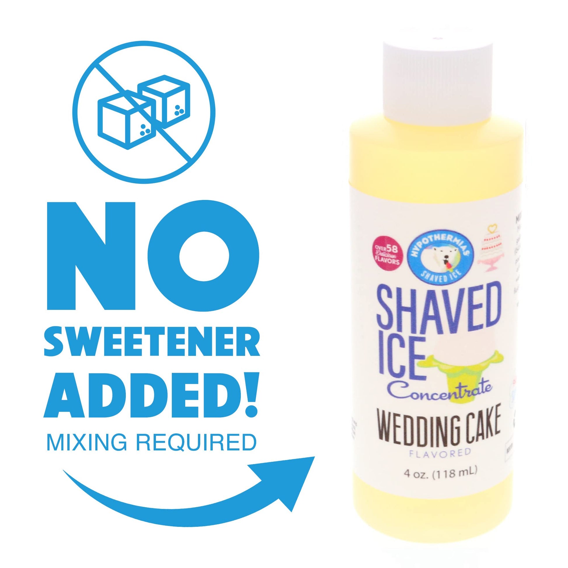 Delicious Wedding Cake Shaved Ice Or Snow Cone Unsweetened Flavor Concentrate. Each 4 Ounces Of Concentrate Will Make 1 Gallon Of Syrup When Mixed. This Is Professional, True To Taste Shaved Ice Flavor. Mixing Directions- To Make A Gallon Of Syrup: Use Four Ounces Of Flavor Concentrate (Shake Well) With Five Pounds Of Sugar, Fill With Water (Approximately 1/2 Gallon Of Water) To The Gallon Mark And Stir Well.Preservatives Optional. Life Of Concentrate Is Two To Three Years. To Extend The Life Of The Syrups You Can Add Optional Preservatives (Citric Acid, Sodium Benzoate). Please Keep At Room Temperature And Out Of Direct Sunlight And Heat.Made In The Usa.*** A Note About The Flavor Concentrates, It Is Extremely Important To Follow The Directions Very Carefully When Making Flavors From The Concentrates. This Is A Flavoring Concentrate, Not A Ready To Use Syrup. You Have To Add Sweetener And Water To The Concentrate To Create The Syrup To Be Used On The Ice. Without The Sweetener, It Will Not Be Sweet. A Concentrate Allows You To Choose The Type And Sweetness Level Of The Syrup. You Can Use Pure Cane Sugar, High Fructose Corn Syrup Or Alternative Sweeteners. Consider Hypothermias' Ready To Use Flavor Line If You Are Looking For A A Pre-Sweetened Shaved Ice Or Sno-Cone Syrup. Must Add Water And Sugar Or Sweetner For Syrup To Be Ready To Use. Each 4 Ounce Bottle Makes 1 Gallon Of Syrup When Mixed.