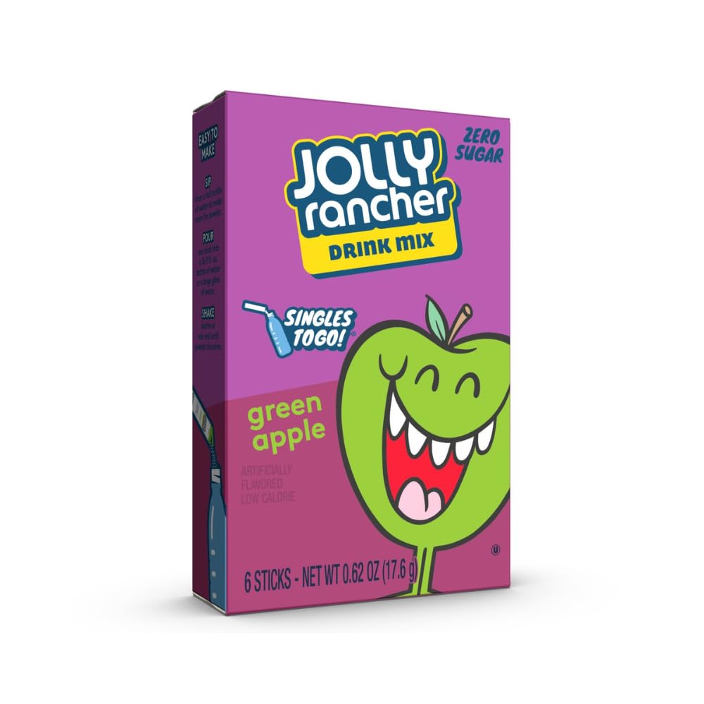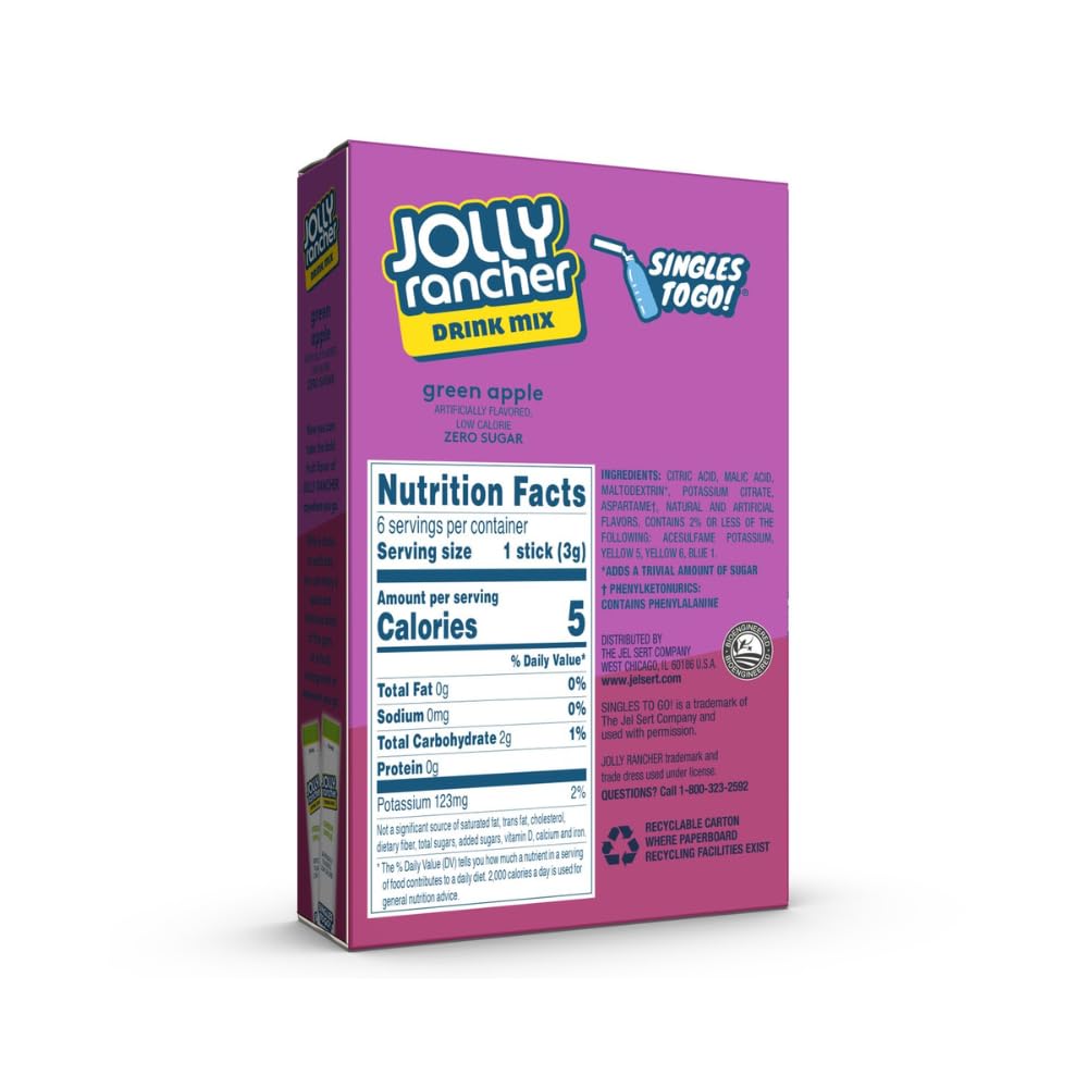 Q: Is Jolly Rancher Singles-To-Go drink mix sugar-free?A: Yes, Jolly Rancher Singles-To-Go Green Apple Drink Mix is sugar-free, making it a great option for those looking to reduce their sugar intake while still enjoying a flavorful beverage.