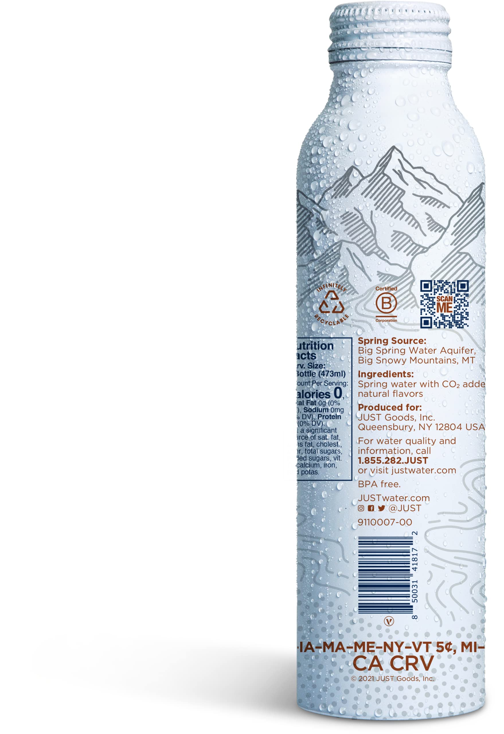 Q: Where does the water for JUST Bubbles come from?A: The water used in JUST Bubbles Coconut Mint is sourced from the Big Snowy Mountains of Montana, flowing through 1200 feet of limestone to reach the underground spring, ensuring its purity and mineral content.