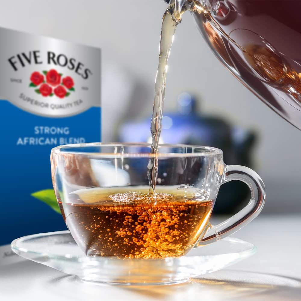 Experience the rich, elegant taste of Five Roses, a beloved South African Ceylon blend tea. Perfect for tea enthusiasts seeking quality and flavor, this tea is crafted to deliver a delightful beverage that can be enjoyed hot or iced.