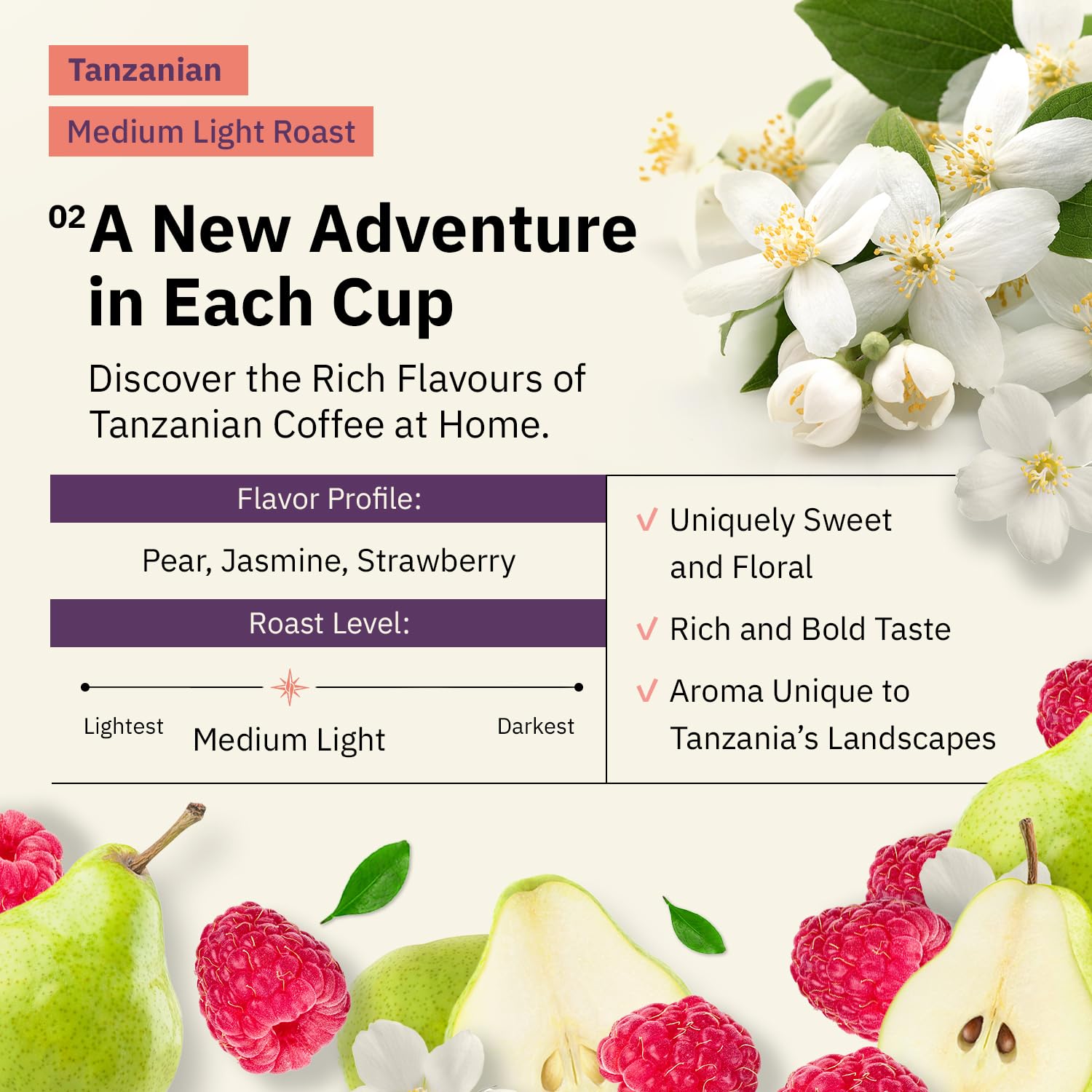 - Q: What are the tasting notes of this coffee? A: The tasting notes of Kochere Tanzanian Peaberry Coffee include floral tones, sweet hints of pear, jasmine, and strawberry, creating a complex and enjoyable drinking experience.