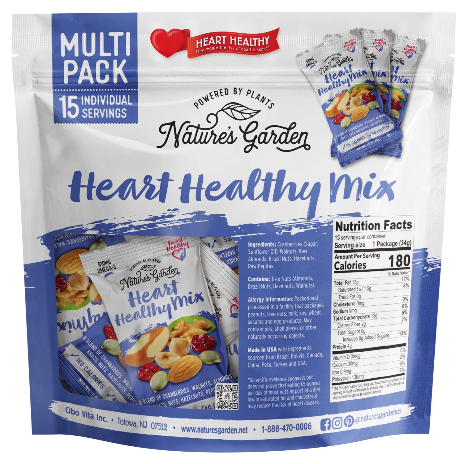 - Q: What are the main ingredients in Nature's Garden Heart Healthy Mix? A: Nature's Garden Heart Healthy Mix features a blend of real fruit and quality nuts, including cranberries, walnuts, roasted almonds, roasted pepitas, and Brazil nuts. This combination provides a delicious and nutritious snacking option.