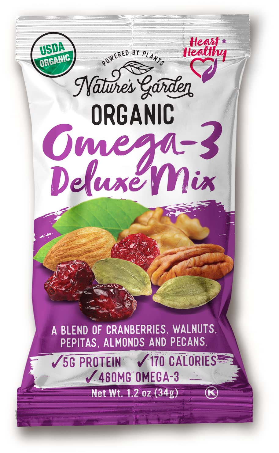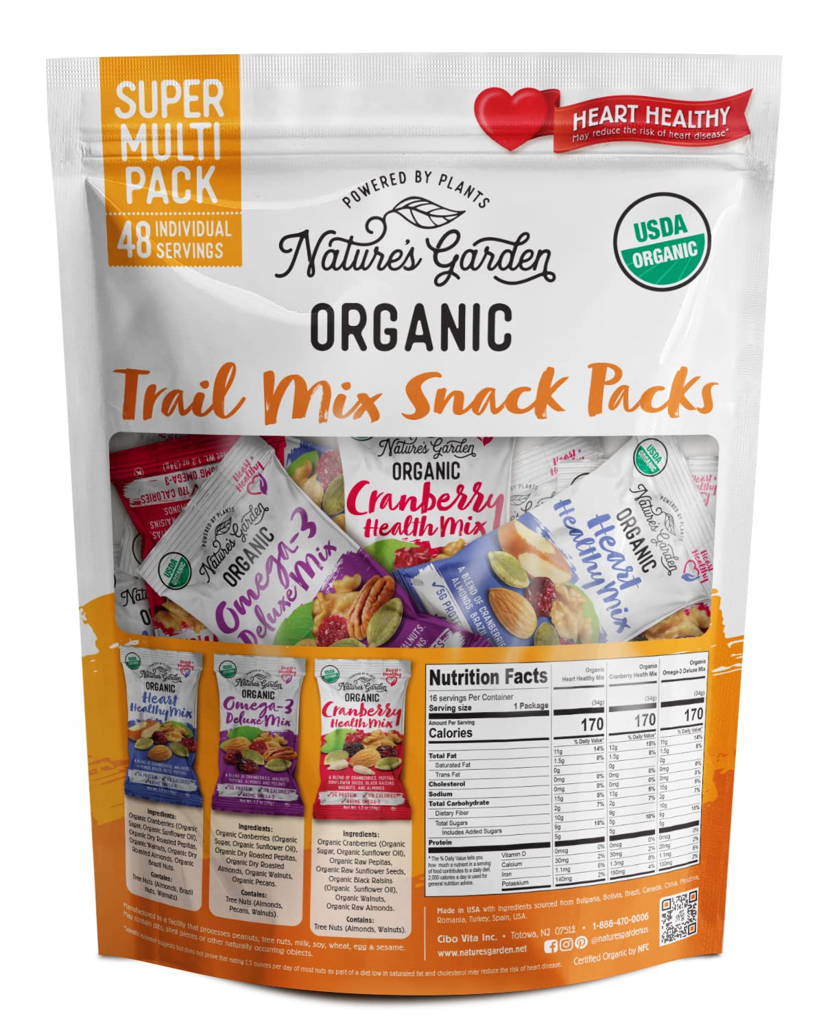 - Q: What are the main ingredients in Nature's Garden Organic Trail Mix Snack Packs? A: Nature's Garden Organic Trail Mix Snack Packs include a blend of high-quality organic ingredients such as almonds, walnuts, pistachios, pecans, pumpkin seeds, and cranberries. These ingredients provide a delicious mix that is both energy-boosting and heart-healthy.