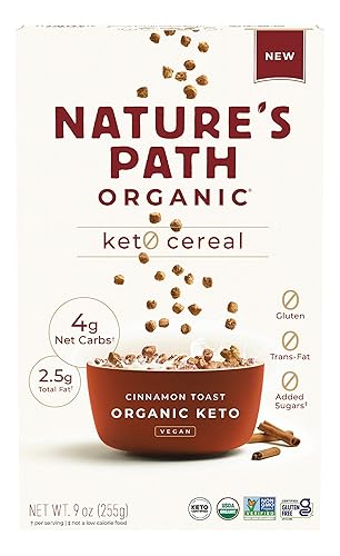 • Q: What makes Nature's Path Cinnamon Toast Keto Breakfast Cereal suitable for a ketogenic diet? A: Nature's Path Cinnamon Toast Keto Breakfast Cereal contains only four grams of net carbs per serving, making it an excellent choice for those following a ketogenic or low-carb diet. The cereal is sweetened with monk fruit and erythritol, which provide a guilt-free sweetness without the added sugars that can hinder ketosis.