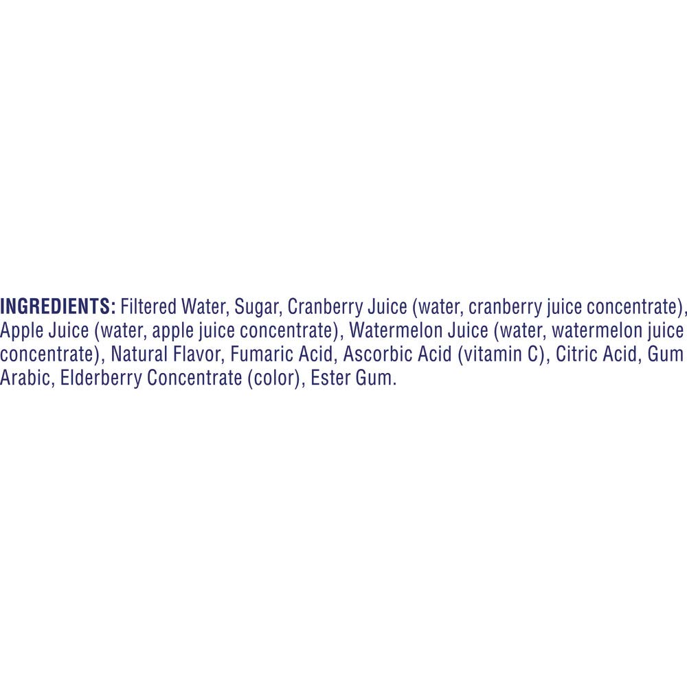 - Q: What are the main ingredients in Ocean Spray® 100% Juice Cranberry Watermelon Juice Blend? A: Ocean Spray® 100% Juice Cranberry Watermelon Juice Blend is made with a blend of four real fruit juices, primarily cranberry and watermelon, providing a naturally refreshing taste without any added sugars.