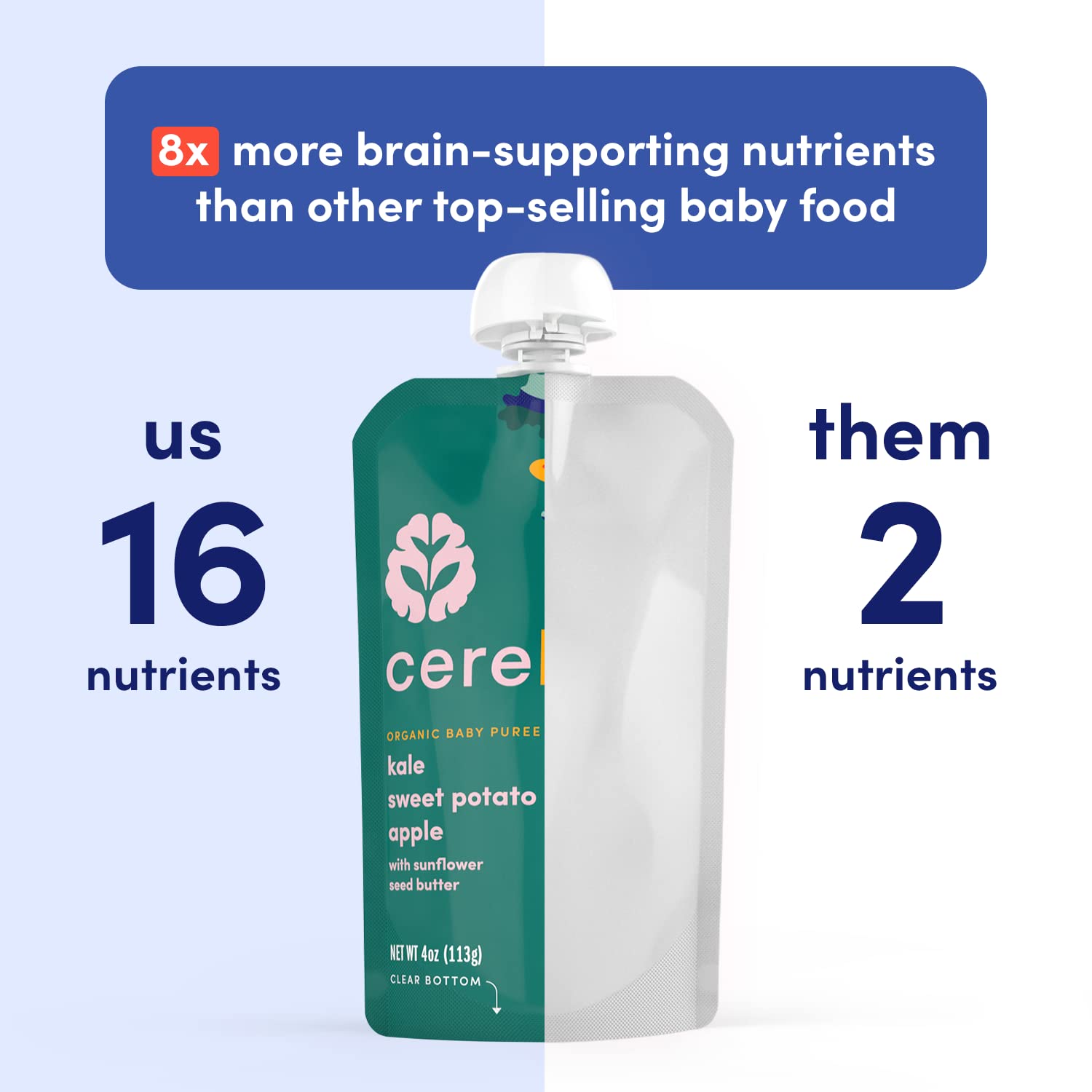 - Q: What are the main ingredients in Cerebelly Organic Baby Food Pouches? A: Cerebelly Organic Baby Food Pouches contain whole foods like kale, sweet potatoes, and sun-ripe apples, blended with sunflower seed butter. These ingredients are carefully selected to provide essential nutrients for your child's brain development.