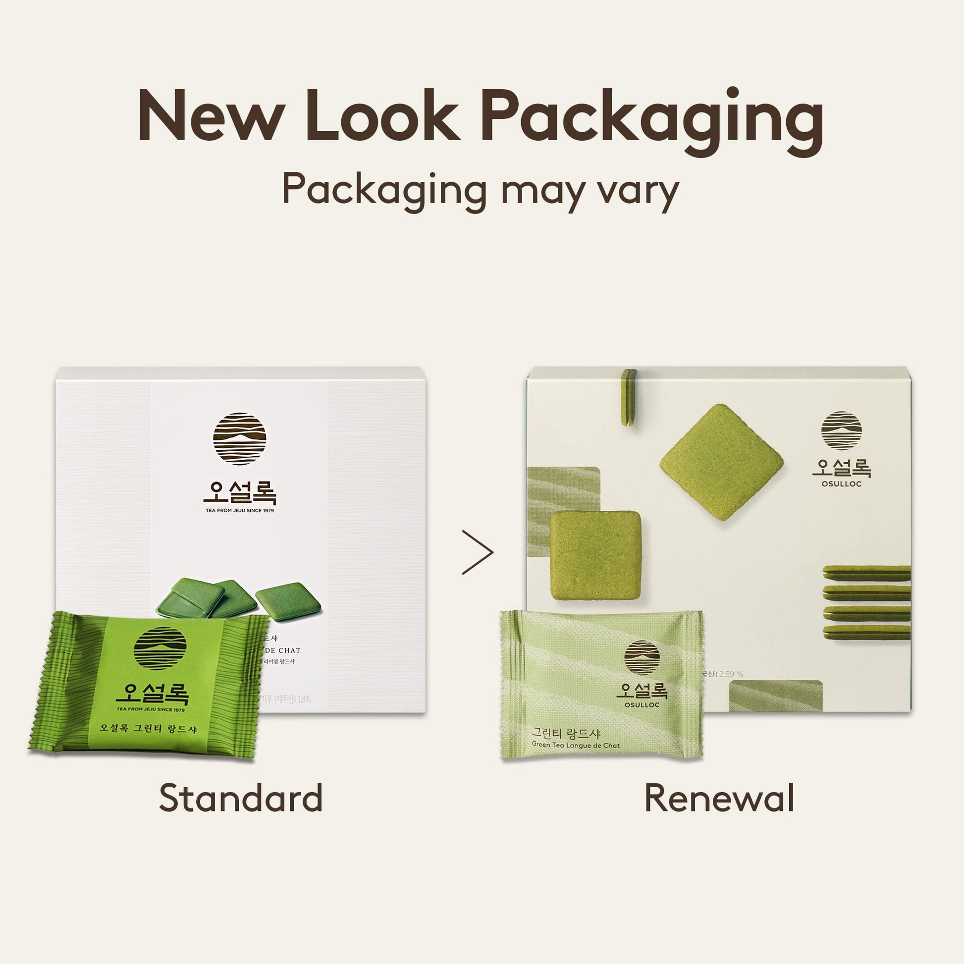 Q: What are OSULLOC Langue de Chat Cookies made from?A: OSULLOC Langue de Chat Cookies are made from premium Jeju green tea powder, sourced from organic Jeju green tea leaves, giving them a rich matcha flavor.