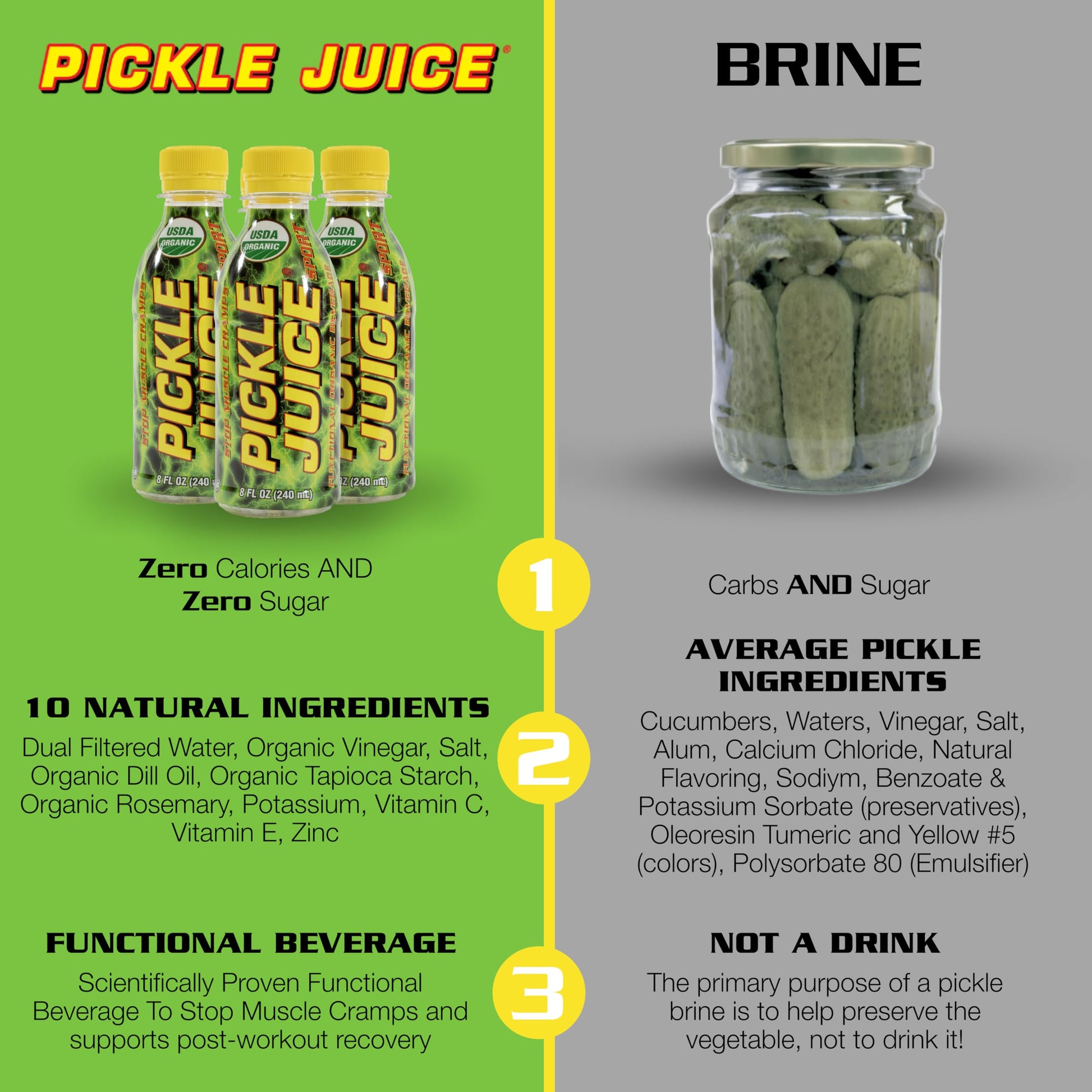 - Q: What makes Pickle Juice Sports Drink different from regular pickle brine? A: Unlike regular pickle brine, Pickle Juice uses a proprietary blend of vinegar and grains, which has been scientifically proven to be more effective in preventing muscle cramps.