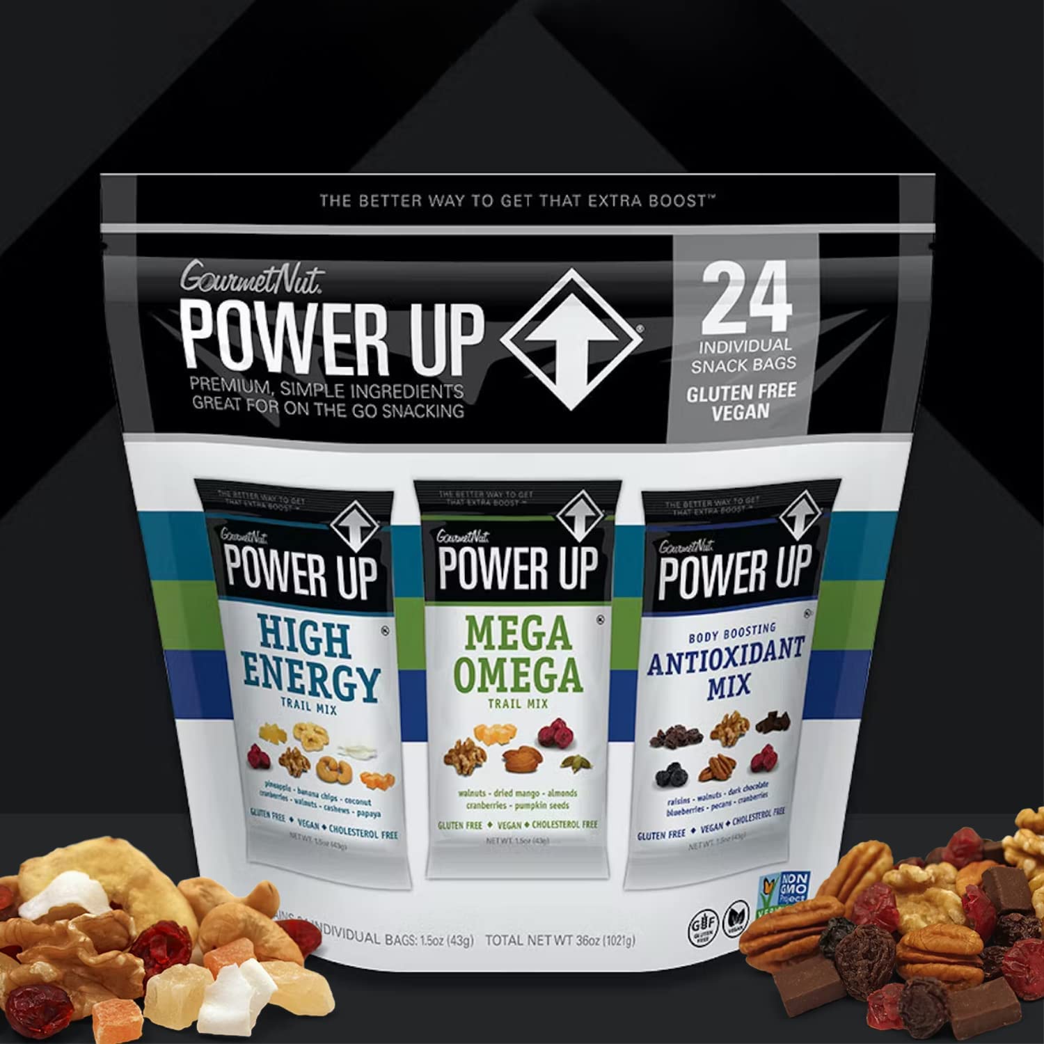 - Q: What is the packaging size of Power Up Premium Trail Mix? A: Power Up Premium Trail Mix comes in a variety pack containing 24 single-serve pouches, each weighing 1.5 ounces. This convenient packaging makes it easy to take on-the-go for a healthy snack anytime.