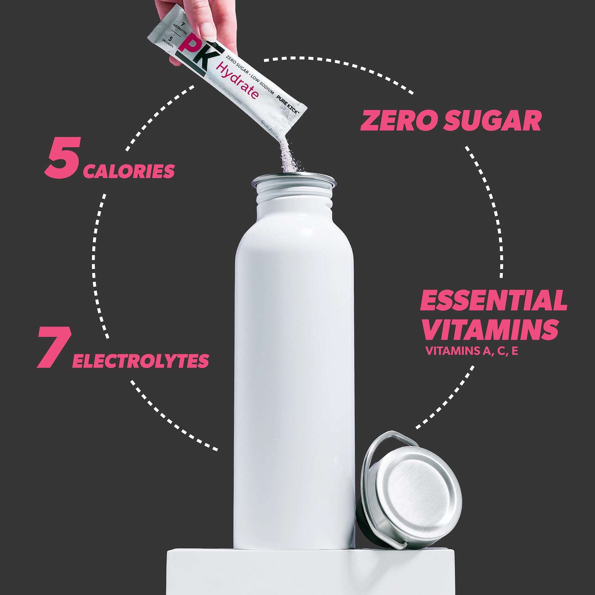 Q: Does Pure Kick Hydration contain sugar or calories?A: No, Pure Kick Hydration is sugar-free and contains zero calories, making it a guilt-free option for those looking to stay hydrated without added sugars.