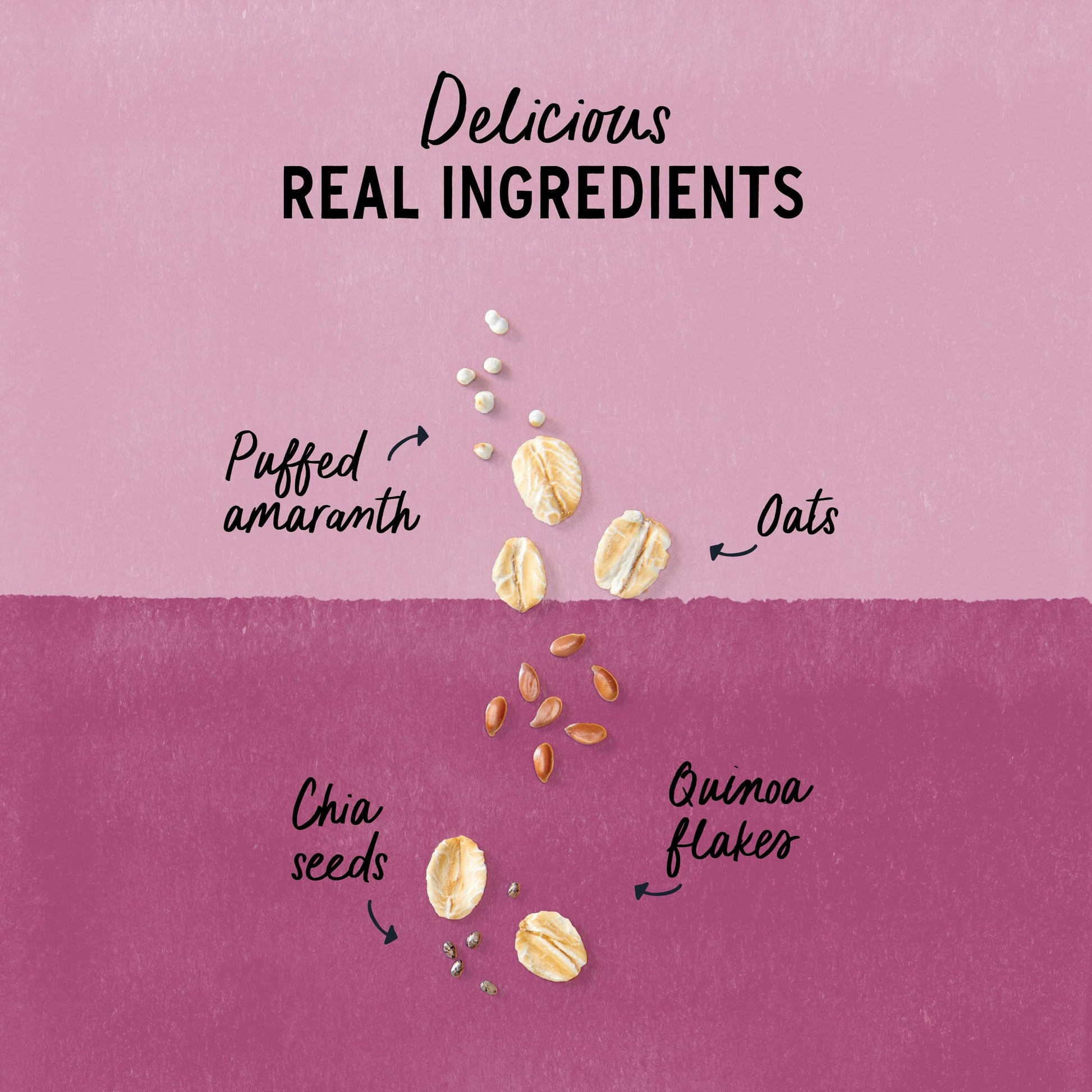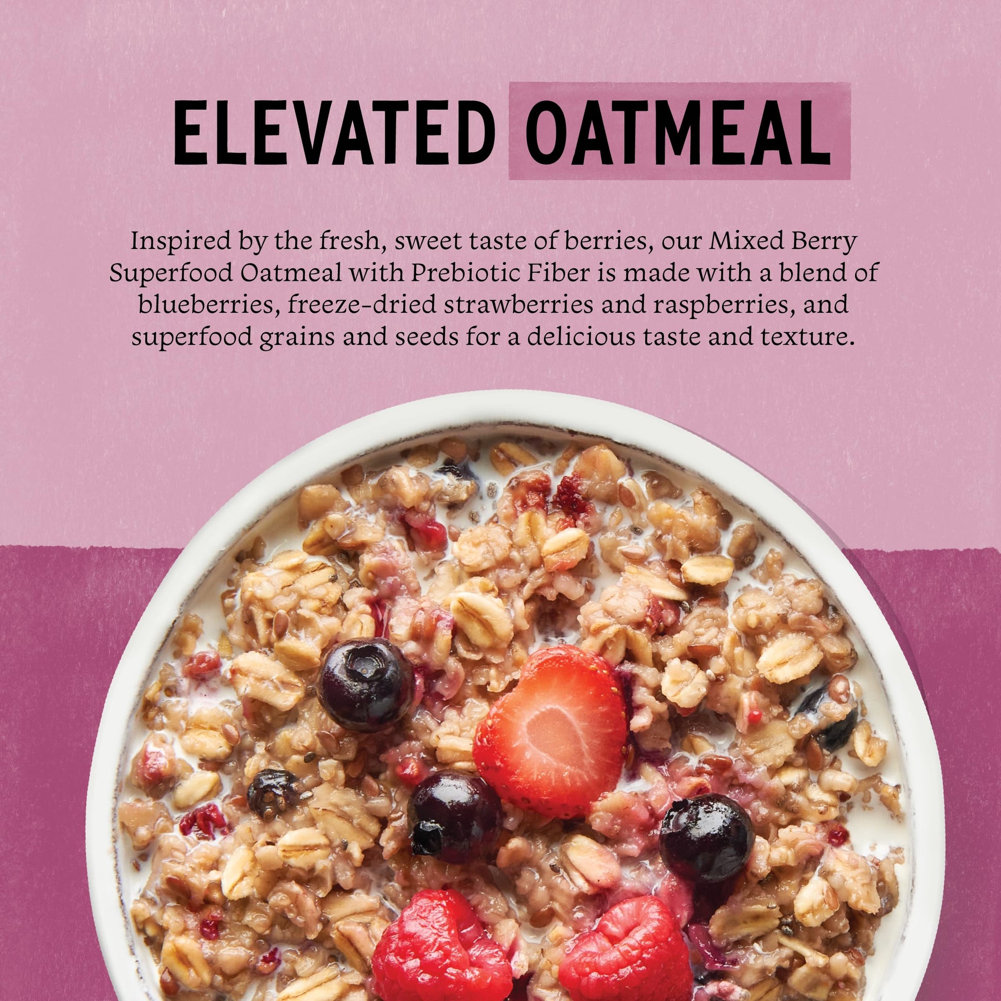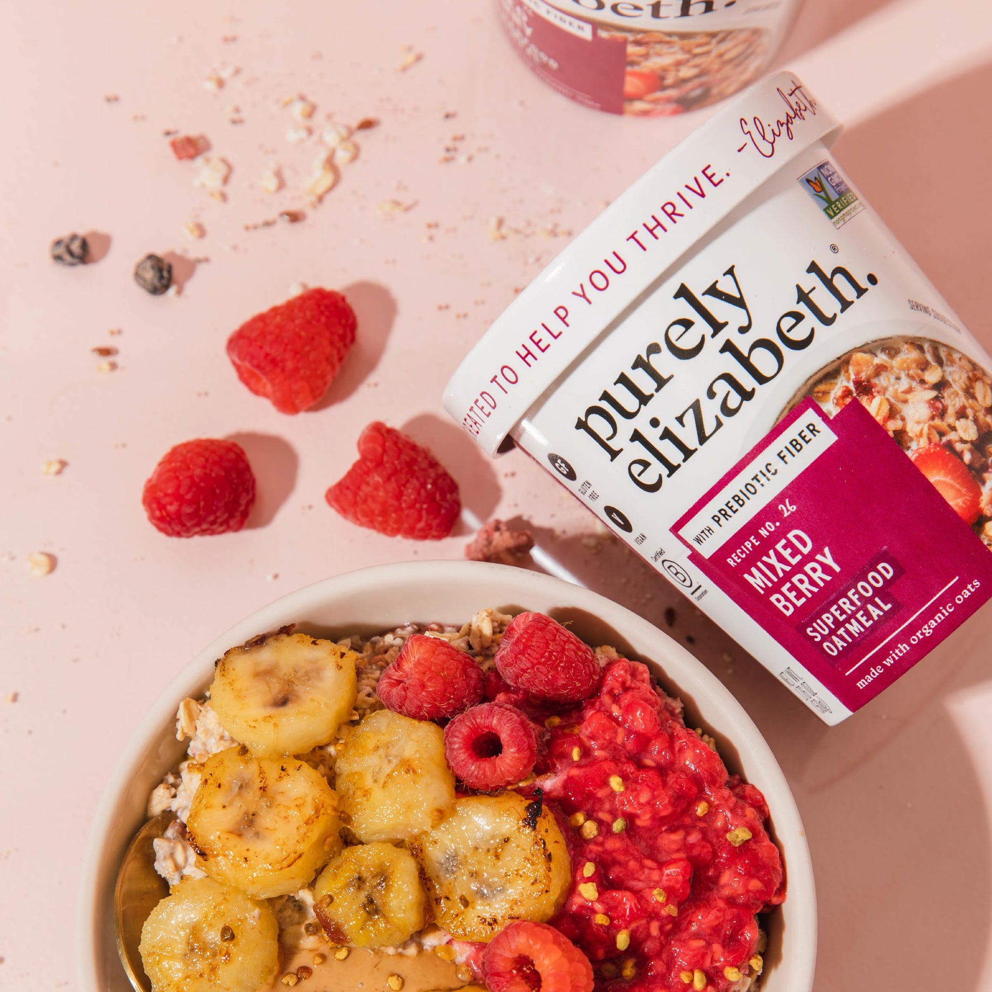 - Q: What are the main ingredients in Purely Elizabeth Mixed Berry Superfood Oatmeal Cups? A: Purely Elizabeth Mixed Berry Superfood Oatmeal Cups are made with wholesome ingredients including gluten-free oats, prebiotic fiber, and a blend of mixed berries. They are vegan-friendly and non-GMO, providing a nutritious option for breakfast.