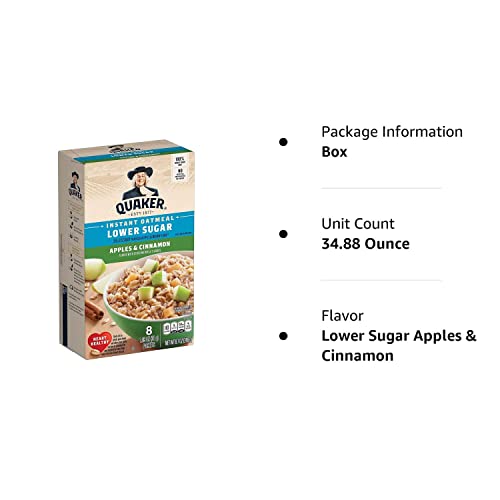 - Q: Is Quaker Instant Oatmeal suitable for a healthy diet? A: Yes, Quaker Instant Oatmeal, Lower Sugar Apples & Cinnamon is a great option for a healthy diet. It is made with whole grain oats, is low in sugar, and provides essential nutrients such as fiber, making it a wholesome breakfast choice.