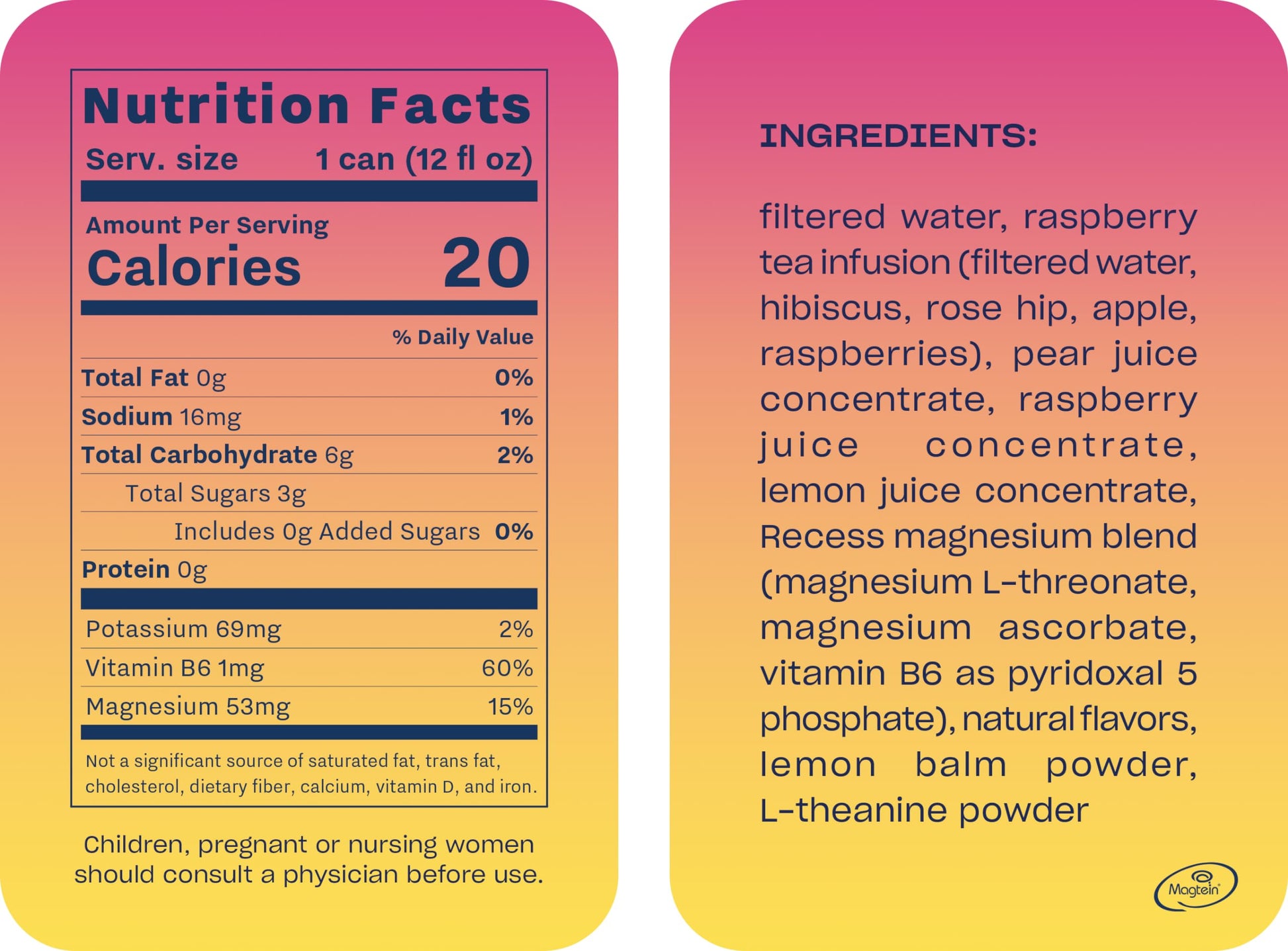 RELAX AND UNWIND: A magnesium and adaptogen-infused sparkling water to help you unwind. | NO FAKE STUFF: Brewed with real raspberries and a hint of lemon for a subtly sweet and tart flavor that feels like a getaway in a can. | FUNCTIONAL INGREDIENTS: Featuring magnesium L-threonate, a new form of magnesium for the brain, with L-theanine and lemon balm. | LOW CAL: Zero added sugar, no fake stuff. Only 20 calories and 3g of sugar from fruit juice. | TAKE A RECESS: When you