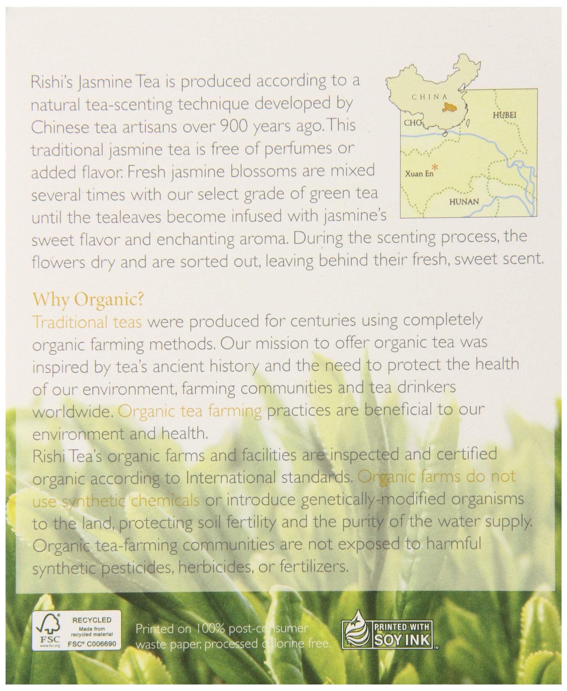 - Q: What are the health benefits of Rishi Tea Jasmine Green Tea? A: Rishi Tea Jasmine Green Tea is USDA Organic and Non-GMO, offering various health benefits. It is rich in antioxidants, supports metabolism, and may enhance mental clarity and mood due to its caffeine content and floral aroma.
