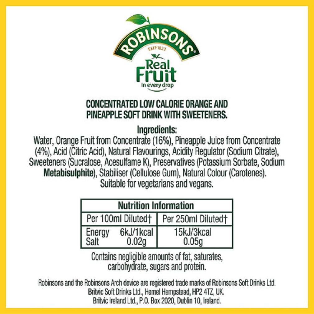 Q: What is Robinsons Double Strength Orange & Pineapple Fruit Squash?A: Robinsons Double Strength Orange & Pineapple Fruit Squash is a low-calorie, concentrated cordial made from real fruit juices, specifically orange and pineapple, with no added sugar. It provides a refreshing drink that can be diluted for multiple servings.