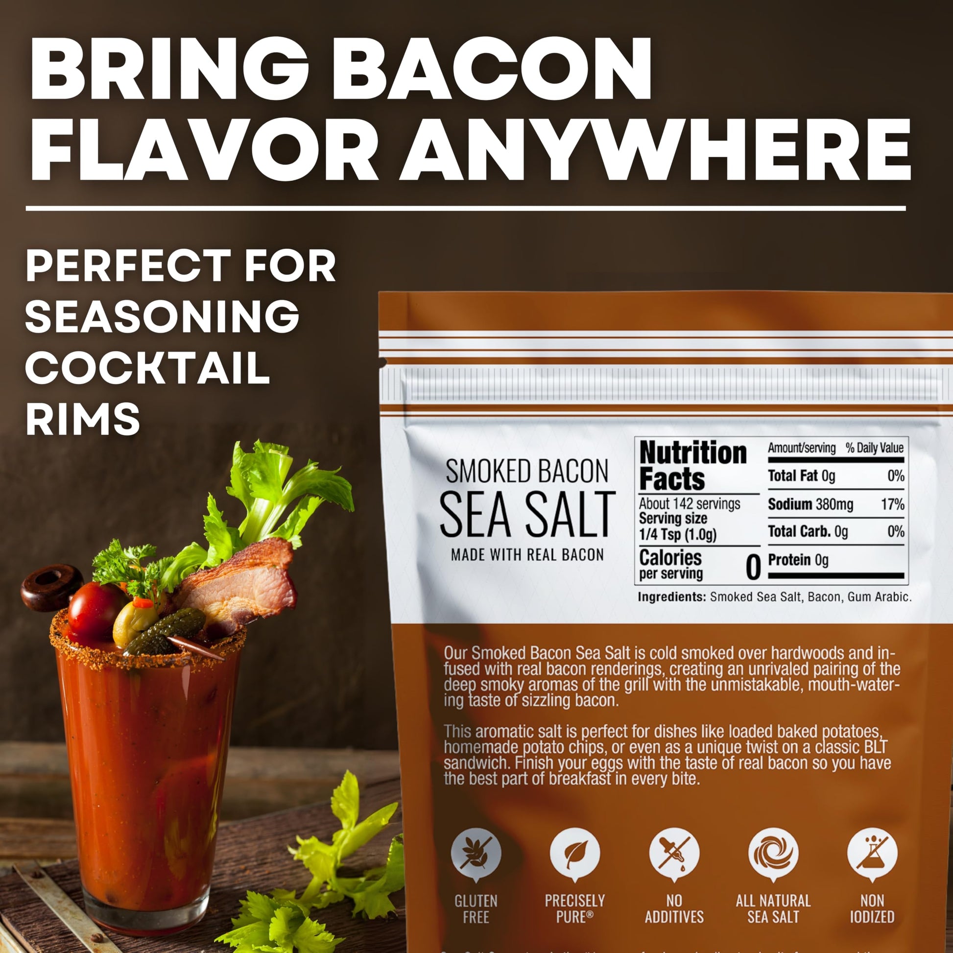 - Q: What are the main ingredients in Sea Salt Superstore Bacon Seasoning? A: The main ingredients in Sea Salt Superstore Bacon Seasoning include all-natural sea salt infused with the smoky essence of real bacon and alderwood. It is free from gluten, MSG, GMOs, dairy, and soy.