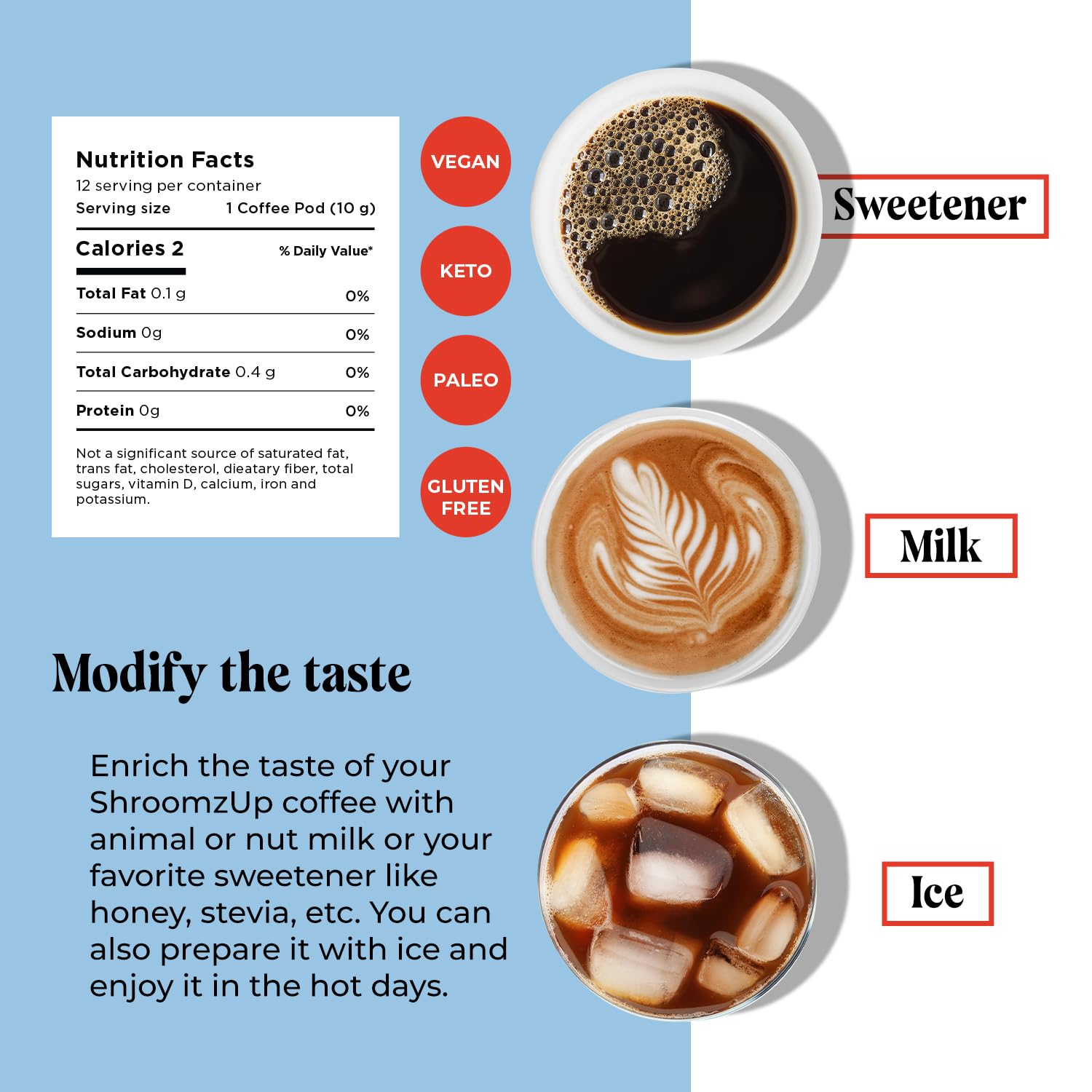 Q: Is Shroomzup Mushroom Coffee suitable for special diets?A: Yes, Shroomzup Mushroom Coffee is 100% natural, gluten-free, vegan, and compatible with Keto and Paleo diets. It contains no sugar, making it a healthy choice for those following various dietary restrictions.
