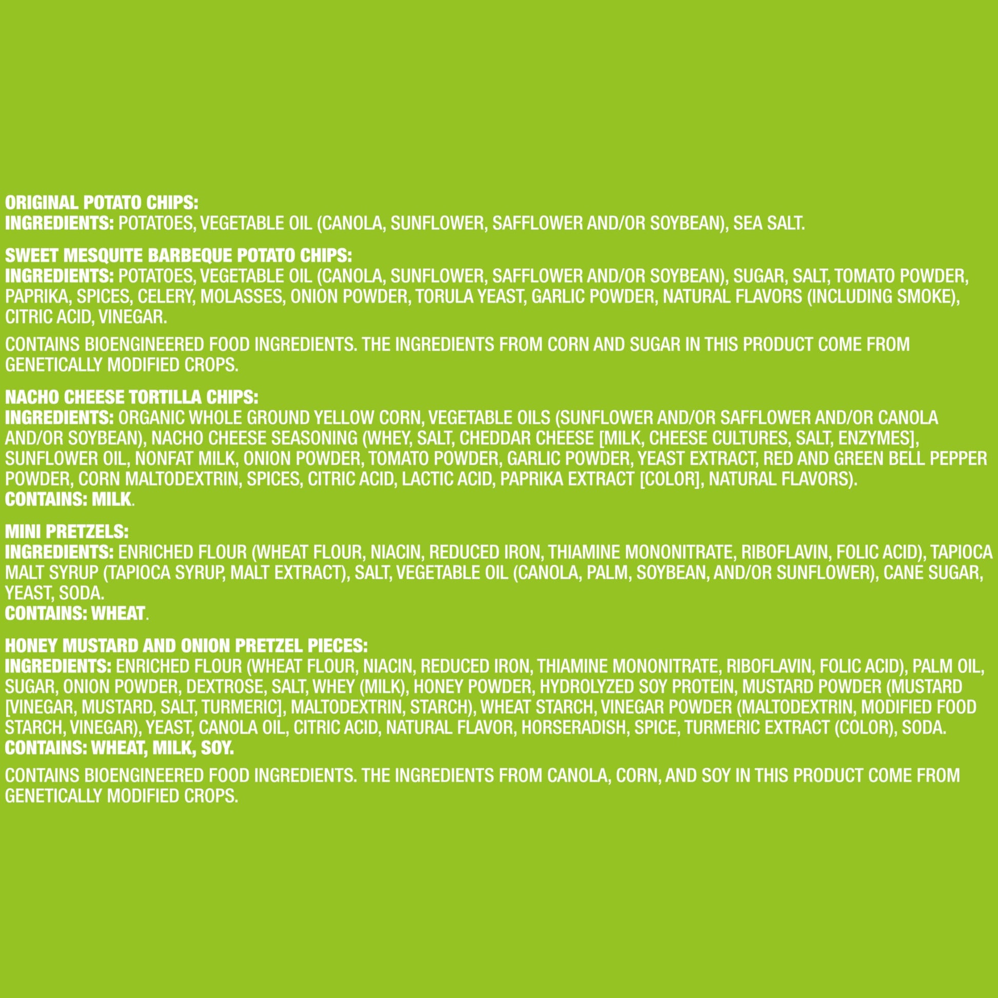 Get a variety of Snyder’s of Hanover pretzels, Cape Cod potato chips, and Late July tortilla chips in our delicious 30-count variety pack, including: Snyder’s of Hanover Minis, Snyder’s of Hanover Pieces Honey Mustard & Onion, Cape Cod Original Sea Salt, and Cape Cod Sweet Mesquite Barbeque, and Late July Nacho Cheese. 100 Calorie Mini Pretzels from Snyder’s of Hanover are oven-baked for an irresistibly crunchy, bite-size snack. Cape Cod Kettle Chips come from choice potatoes sliced perfectly and cooked in custom kettles. Enjoy the bold flavor of our Late July Nacho Cheese Tortilla Chips, made with whole ground yellow corn and seasoned with real cheese, blended with authentic nacho spices.