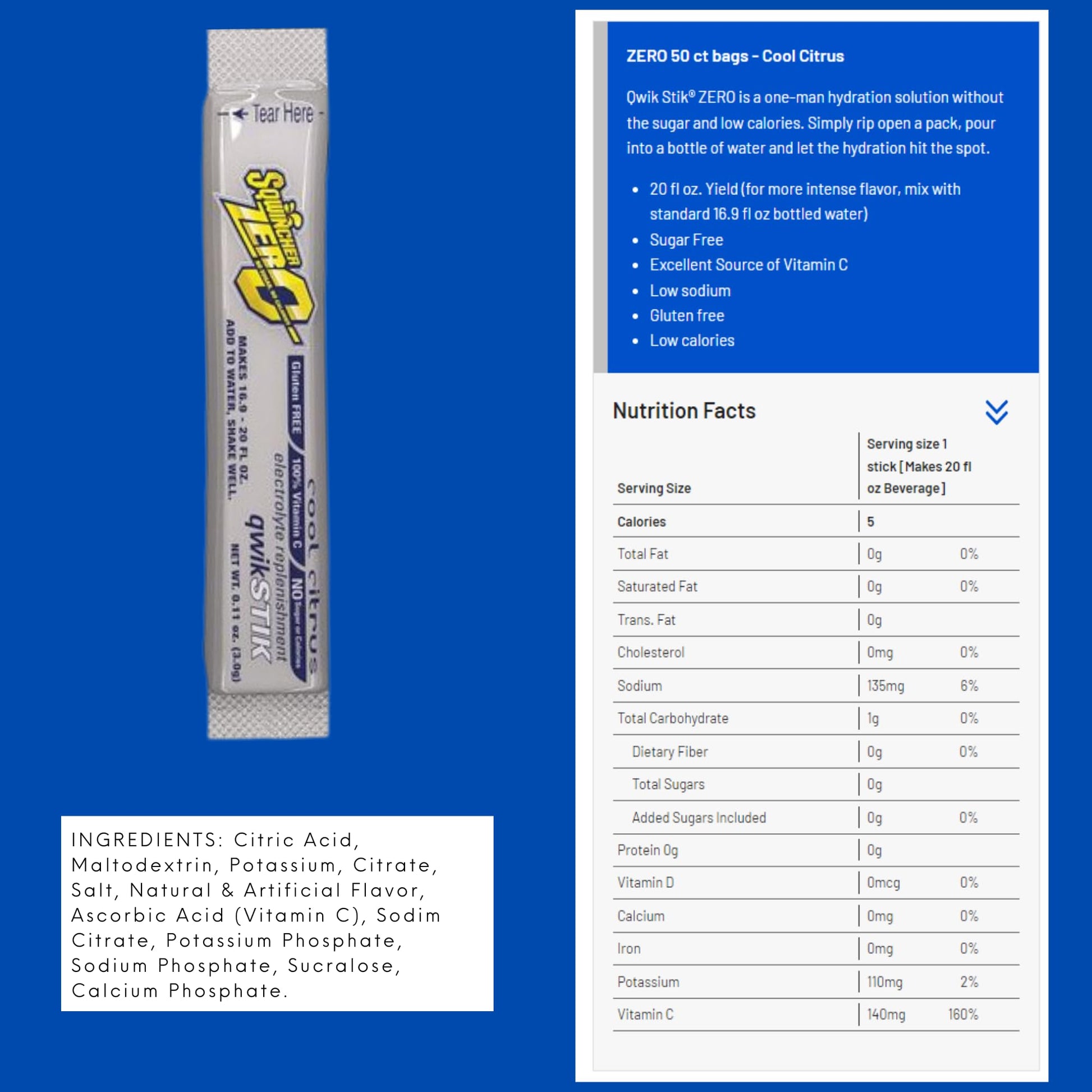- Q: What are the benefits of using Sqwincher Zero Qwik Stik for hydration? A: Sqwincher Zero Qwik Stik provides essential electrolyte replenishment, helping to restore fluids and electrolytes lost during physical activity, illness, or heat exposure. Its zero sugar and low-calorie formula make it a healthy choice for hydration without added calories.