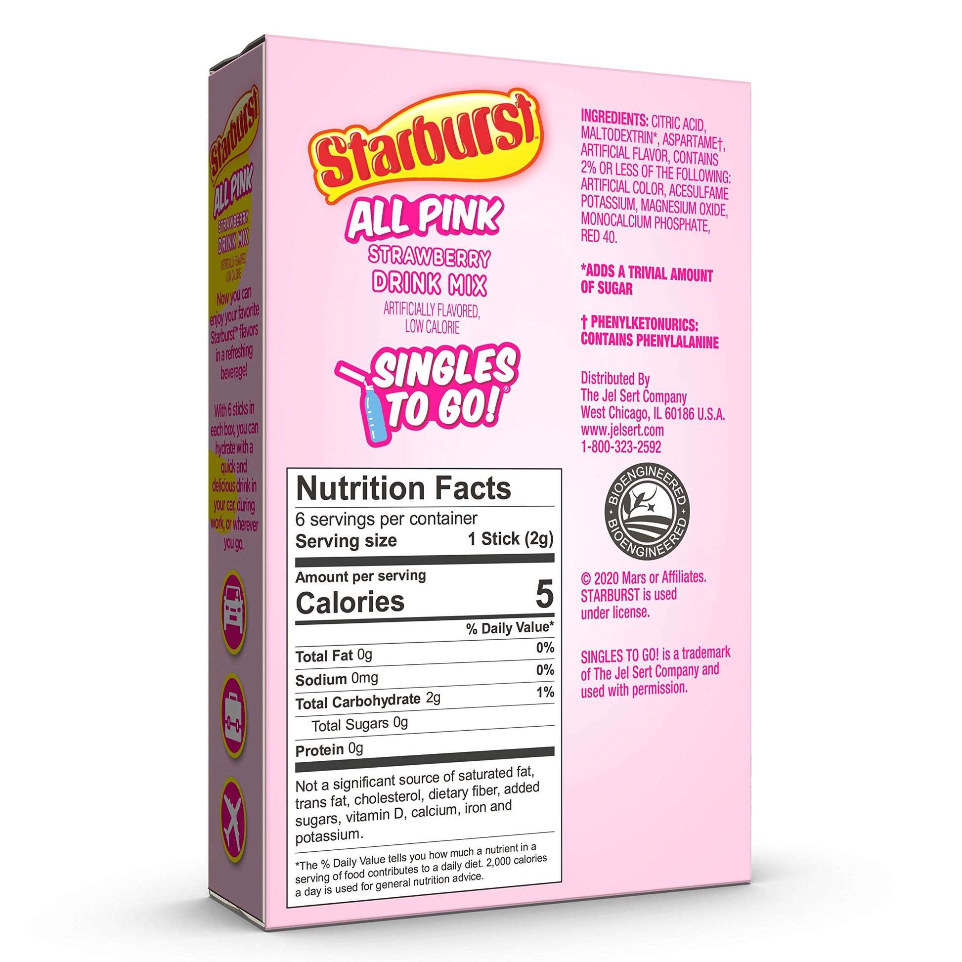 Bring The Unexplainably Juicy Flavor With You Everywhere You Go! The Starburst Singles To Go Powdered Drink Mixes Are A Quick And Easy Way To Add Exciting Flavor To Plain Water. Each Box Contains 6 Powdered Drink Mixes That Are Individually Portioned And Easy To Take With You On The Go. Whether In The Car, On A Plane, Or Sitting At Work Or School, The Single Stick Convenience Makes A Great Tasting Drink Anytime, Anywhere. Its Easy To Mix This Low-Calorie, Zero Sugar Drink Enhancer Into Your Day. Simply Take A Sip From A Full Water Bottle To Make Room For Powder. Pour One Stick Into A 16. 9 Fl. Oz. Bottle Of Water, Shake Until Well Mixed, And Enjoy!