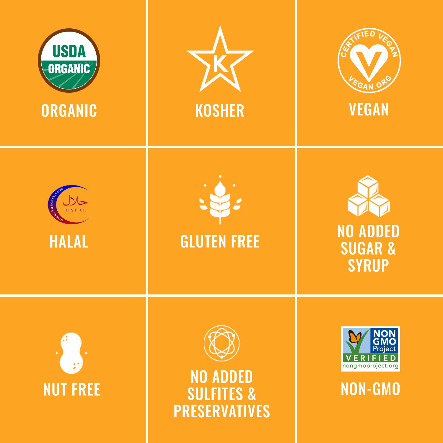 Q: Are these dried apricots suitable for special diets?A: Yes, these organic dried apricots are NON-GMO, VEGAN, HALAL, and KOSHER, making them suitable for a variety of dietary preferences and restrictions.