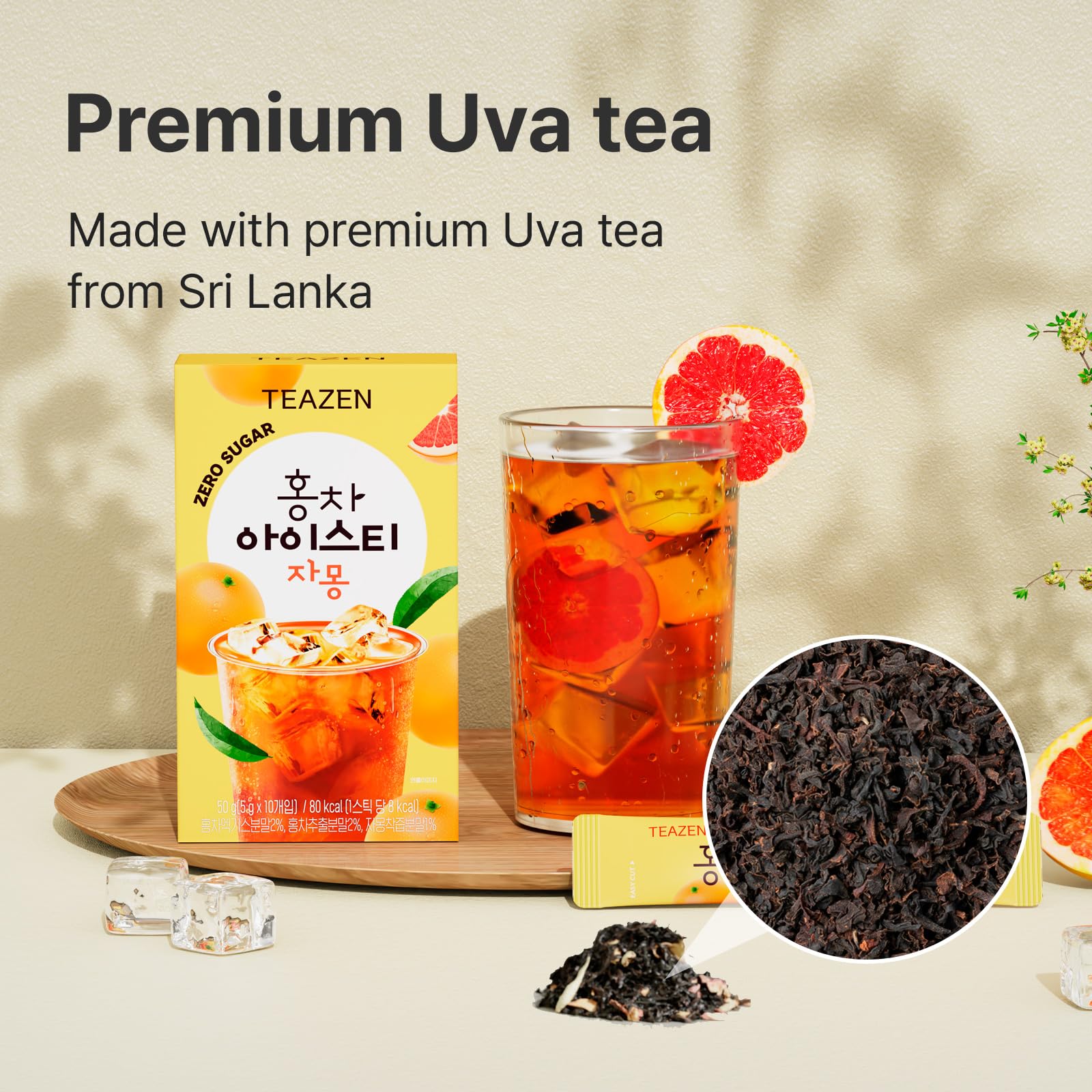 Q: What are the main ingredients in Teazen Summer Grapefruit Iced Tea?A: Teazen Summer Grapefruit Iced Tea is made with Uva black tea and contains no added sugar, making it a refreshing and healthy hydration drink mix.