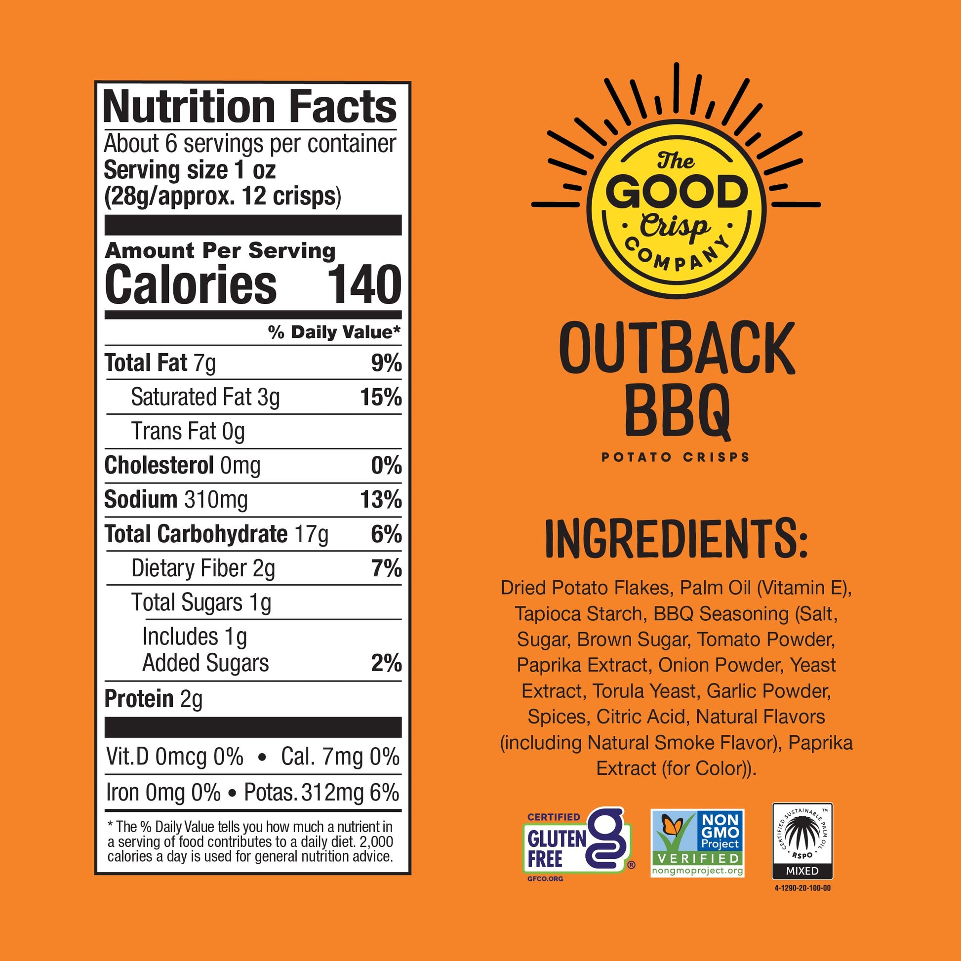 Q: Are The Good Crisp Company Outback BBQ Potato Chips gluten-free?A: Yes, The Good Crisp Company Outback BBQ Potato Chips are gluten-free. They are certified gluten-free, making them a safe snack option for those with gluten sensitivities or celiac disease.