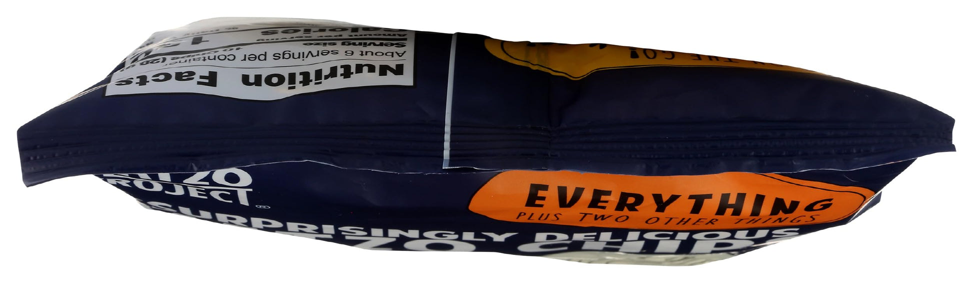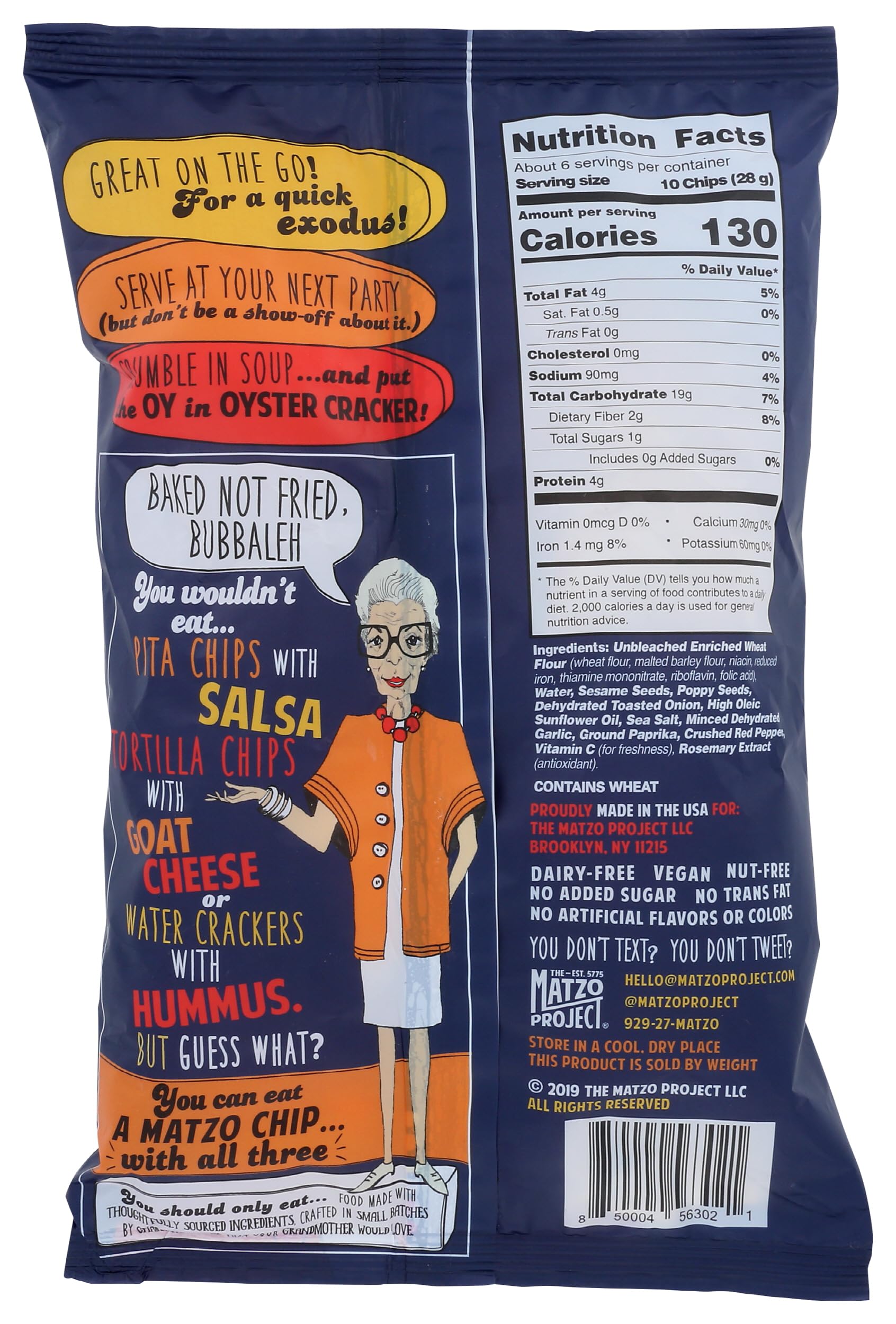 - Q: What is the serving size and nutritional information for THE MATZO PROJECT Everything Matzo Chips? A: The item size is 6 ounces, and serving sizes typically vary based on personal preference. For detailed nutritional information, please check the packaging or the manufacturer's website.