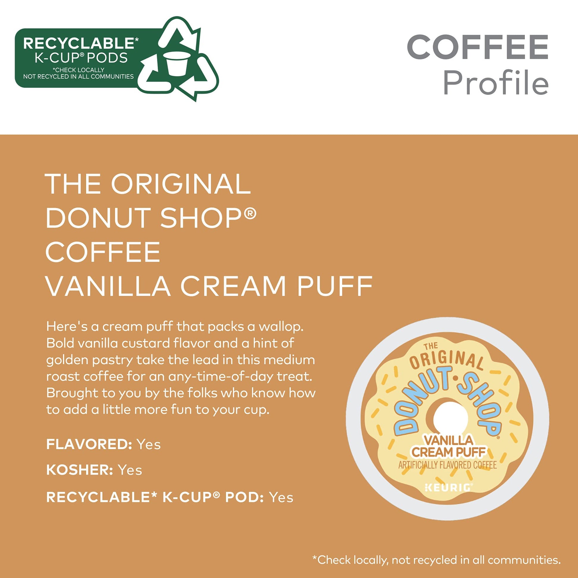 Here’s a cream puff that packs a wallop. Bold vanilla custard flavor and a hint of golden pastry take the lead in this medium roast coffee for an any-time-of-day treat. Brought to you by the folks who know how to add a little more fun to your cup. This is an extra bold variety, so each pod contains more 100% Arabica coffee than regular K-Cup pods. These single-serve K-Cup pods are compatible with all Keurig K-Cup Pod Single-Serve Coffee Makers and brew up to 12 oz. of The Original Donut Shop Vanilla Cream Puff coffee each. Each K-Cup pod is filled with the freshest ground coffee and brews a perfect, great tasting cup of coffee, every time. Certified Orthodox Union Kosher and contains no artificial ingredients. Recyclable* K-Cup Pods: Simple. Delicious. And Recyclable. Enjoy the same great-tasting coffee you know and love, and when you’re done just peel, empty and recycle. *Check locally, not recycled in all communities. Packaging may vary.