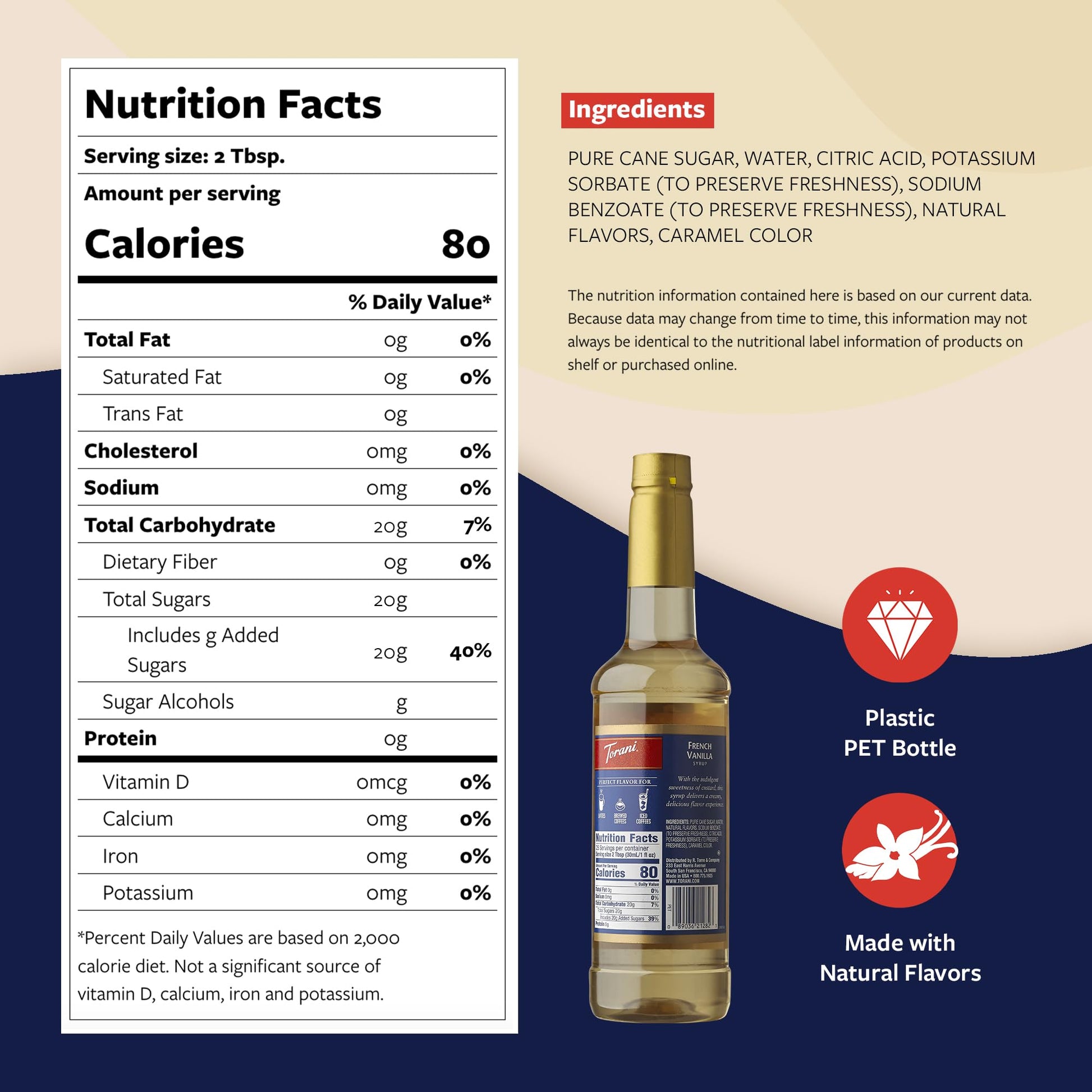Q: Is Torani French Vanilla Syrup made with natural ingredients?A: Torani French Vanilla Syrup is crafted with pure cane sugar and natural flavors, making it a delicious and quality choice for enhancing your favorite drinks.