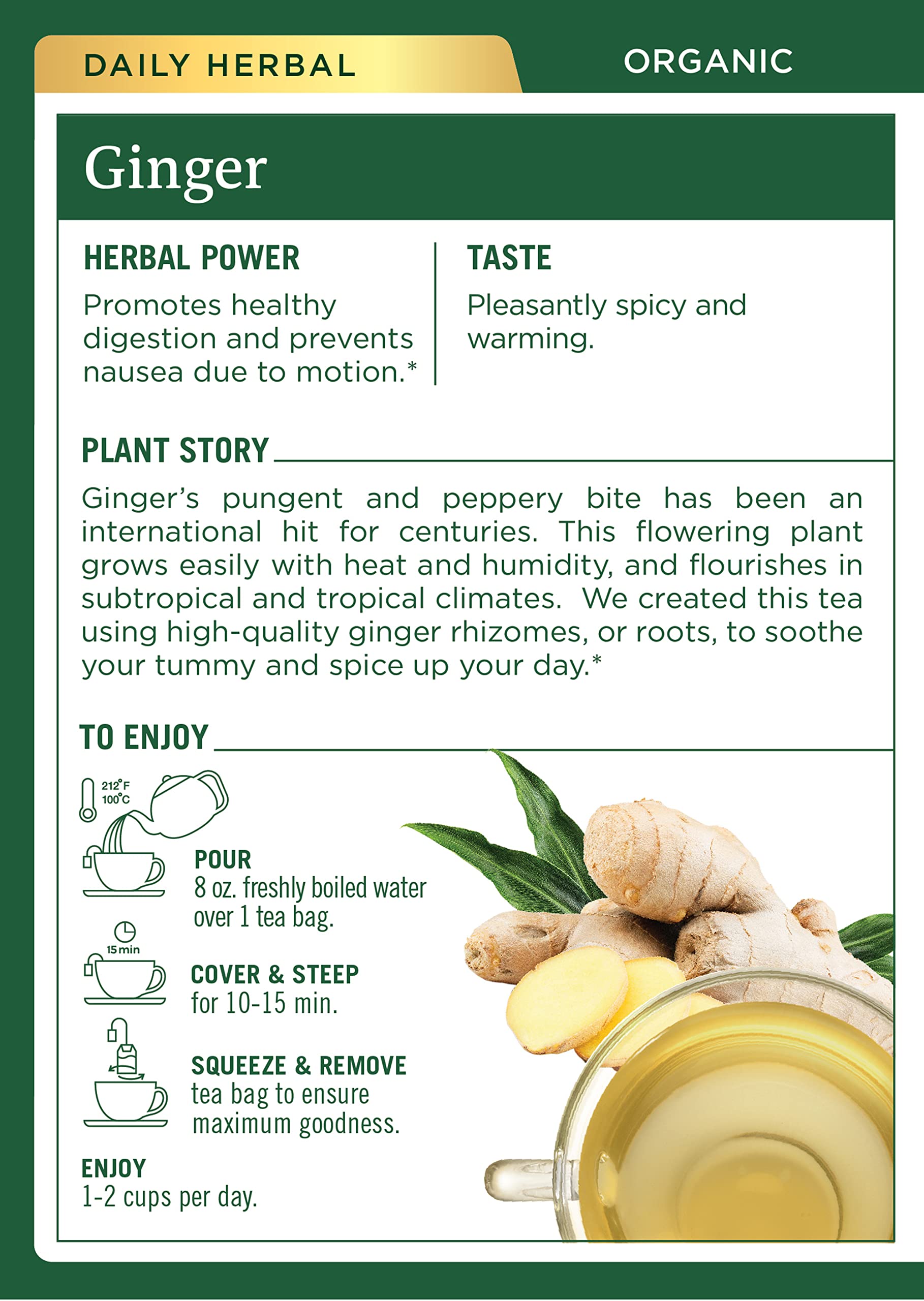 Gingers pungent and peppery bite has been an international hit for centuries. This flowering plant grows easily with heat and humidity and flourishes in subtropical and tropical climates. We created this tea using high-quality ginger rhizomes, or roots, to soothe your tummy and spice up your day.