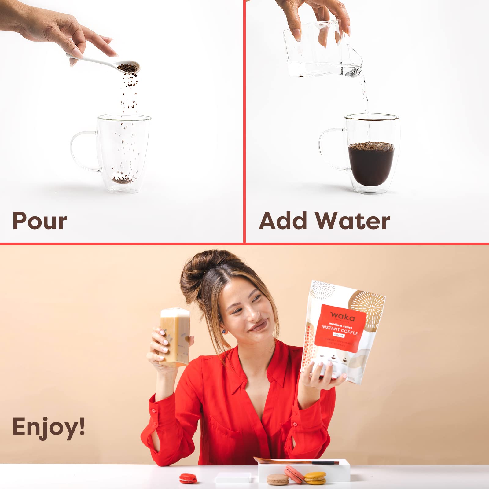 Q: Is Waka Instant Coffee suitable for those avoiding caffeine?A: Yes, Waka’s Decaffeinated Medium Roast provides a smooth flavor with approximately 3mg of caffeine per serving, making it a great option for those looking to enjoy coffee without the jitters.