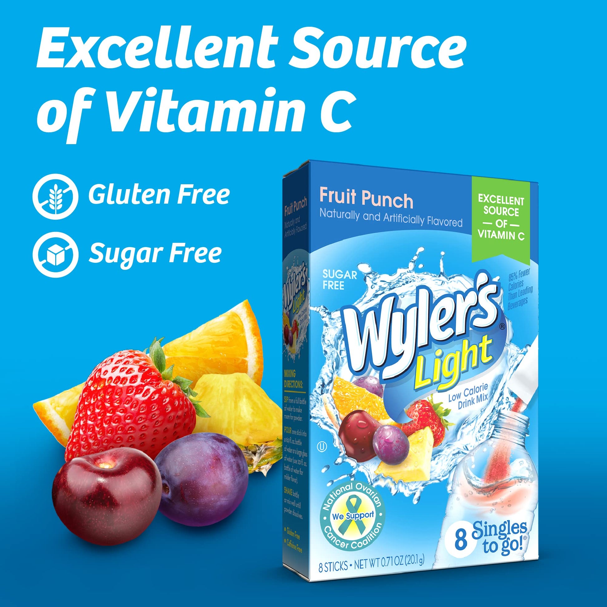 If Getting Your Family To Drink Enough Water Is A Chore, Wylers Light Drink Mix Can Make Hydration Taste Great! With Just 5 Calories Per Packet And No Sugar, Wylers Light Drink Mix Is A Better Choice Than Most Soft Drinks And Come In A Wide Variety Of Flavors. Wylers Light Singles To Go Are Also An Excellent Source Of Vitamin C.Convenient And Easy, Wylers Light Singles Are Perfect For Adding To The Average Water Bottle. Simplysip From The Bottle To Make Room For The Powder, Pour In The Flavor Of Your Choice And Shake Bottle To Mix- Or Stir Well Into A Glass Of Water. For A Milder Flavor, Mix With A 20 Fl. Oz Bottle Of Water Rather Than A Standard 16.9 Oz Bottle.Wylers Light Powder Packets To Go Come In An 8-Count Box, And The Case Contains 12 Boxes, Giving You 96 Delicious Servings -Perfect For Taking To The Office, Gym, Backyard Gatherings Or Anywhere In Between.