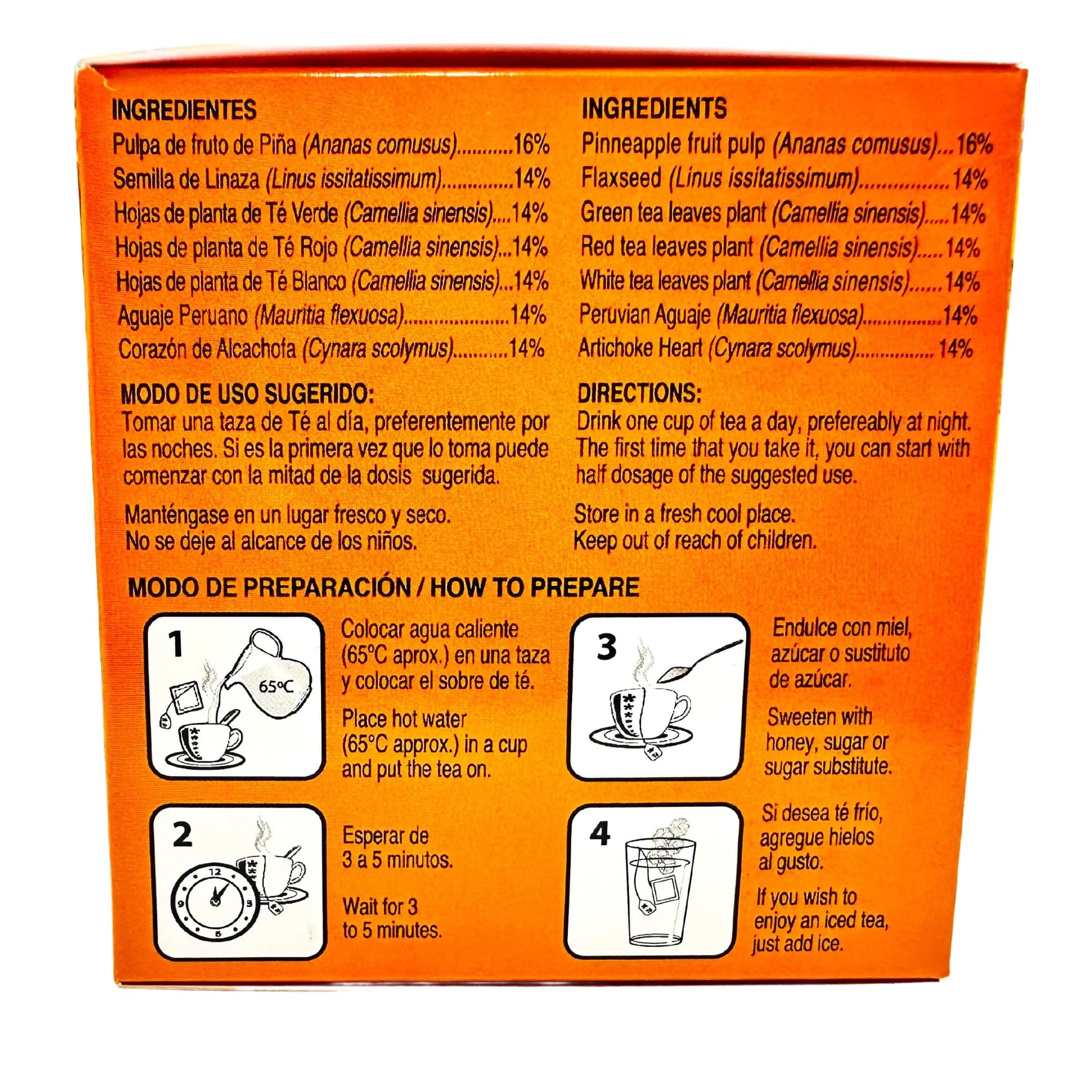The product comes in two boxes, each containing 30 tea bags for a full 60-day supply. Pinalim Plus combines the original ingredients of the popular Pinalim tea—such as pineapple, flaxseed, and a variety of teas (green, red, and white)—with two powerful new additions: Peruvian Aguaje and Artichoke Heart. This unique combination creates a flavorful tea that is easy to incorporate into your daily routine. Simply enjoy one tea bag each night. Being caffeine-free, it is perfect for evening use and can be taken daily or as needed to help maintain digestive wellness.