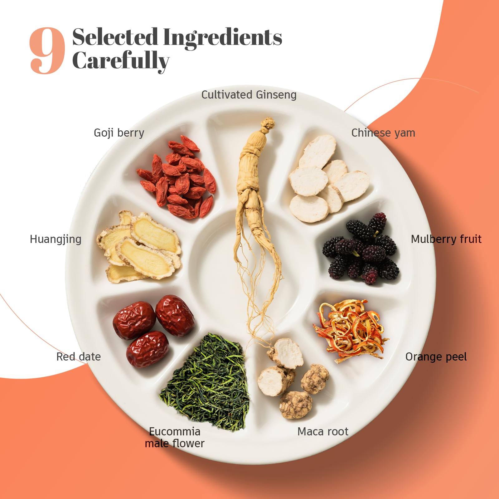 - Q: What are the key ingredients in the Ginseng Six Treasure Kidney Tea? A: The Ginseng Six Treasure Kidney Tea includes premium botanicals such as ginseng, wolfberry (goji berry), Chinese yam, red dates, polygonatum (huang jing), mulberry, and maca, providing a blend of nine precious ingredients.