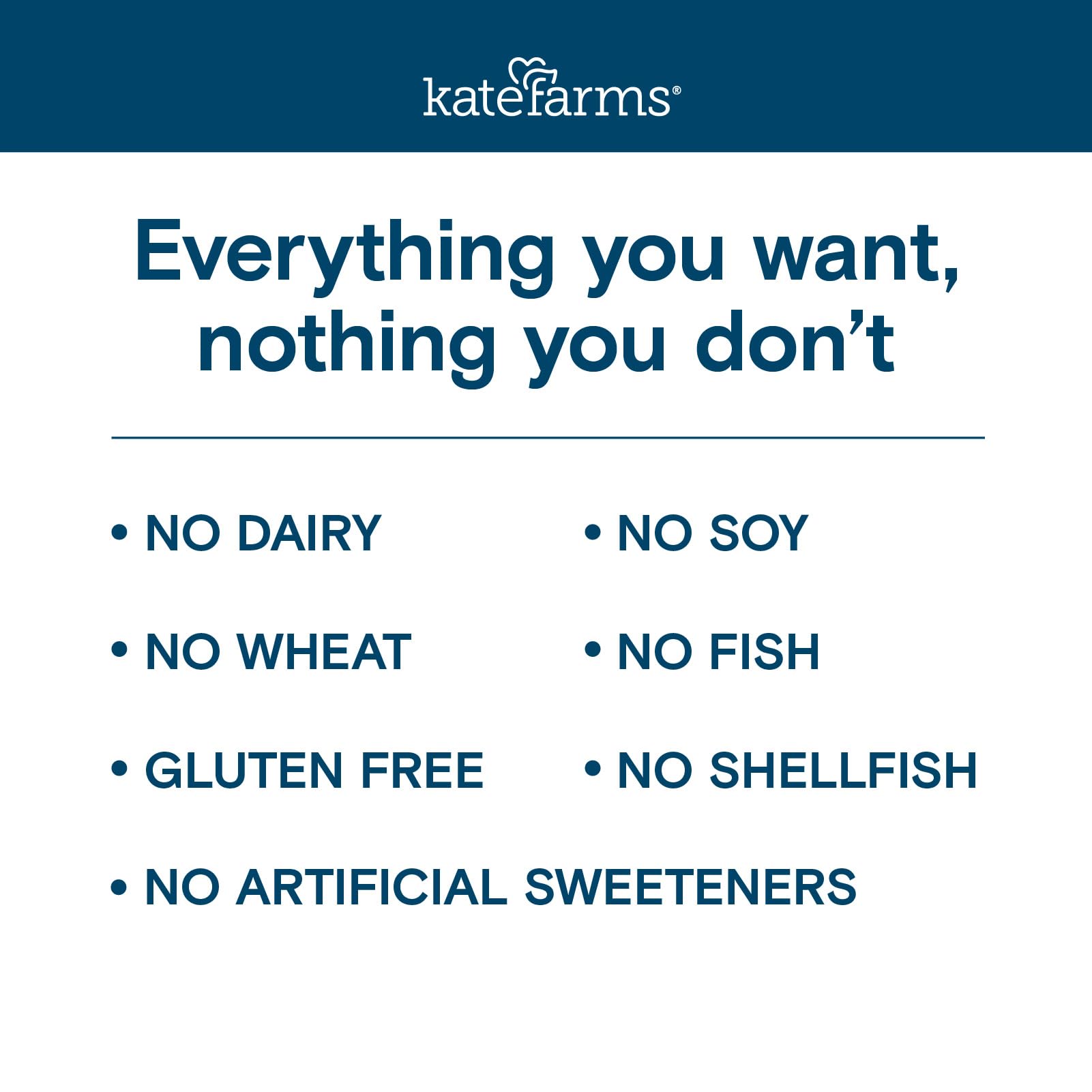 - Q: Is KATE FARMS Peptide 1.0 suitable for people with dietary restrictions? A: Yes, KATE FARMS Organic Adult Peptide 1.0 is suitable for various dietary restrictions, as it is Non-GMO, gluten free, and certified kosher.