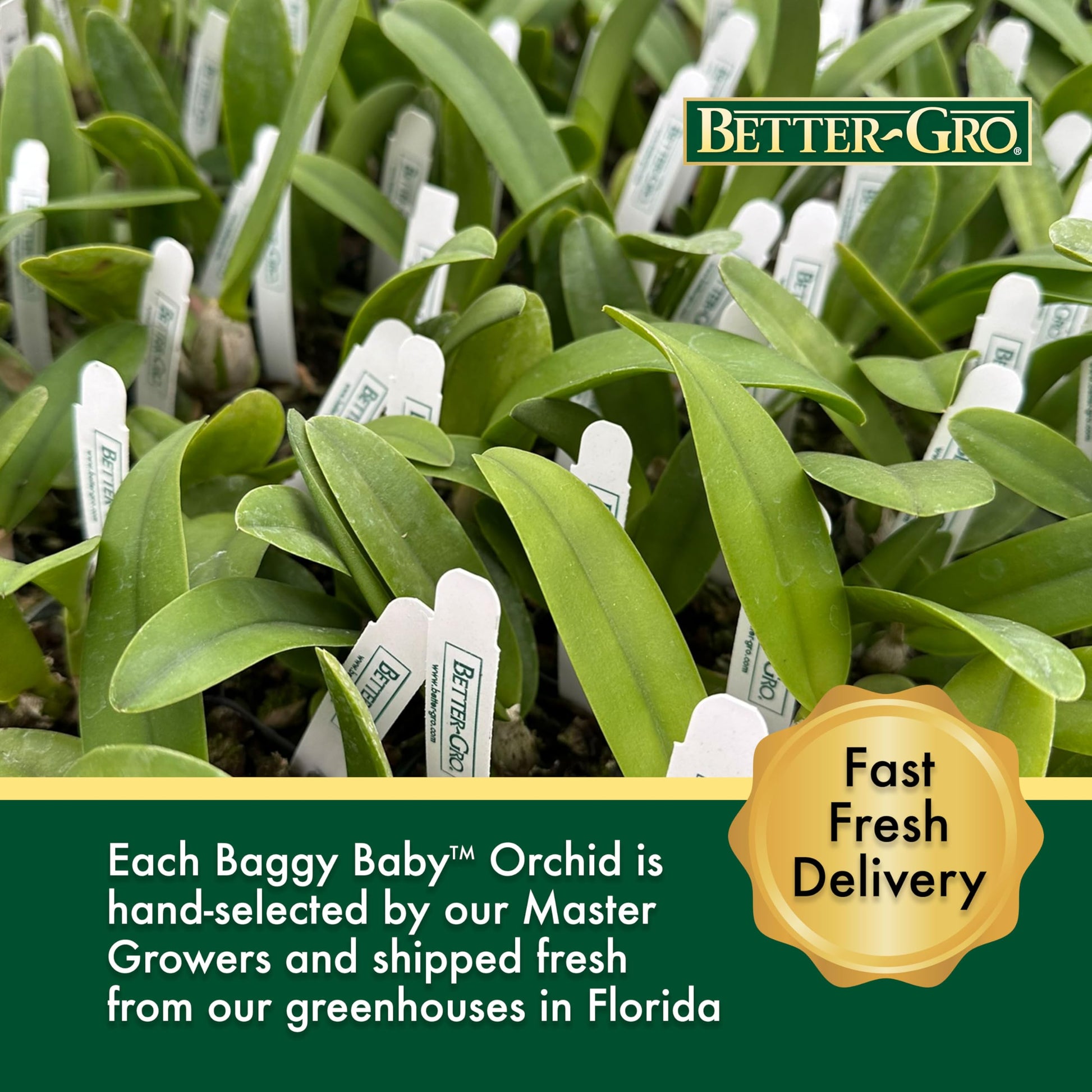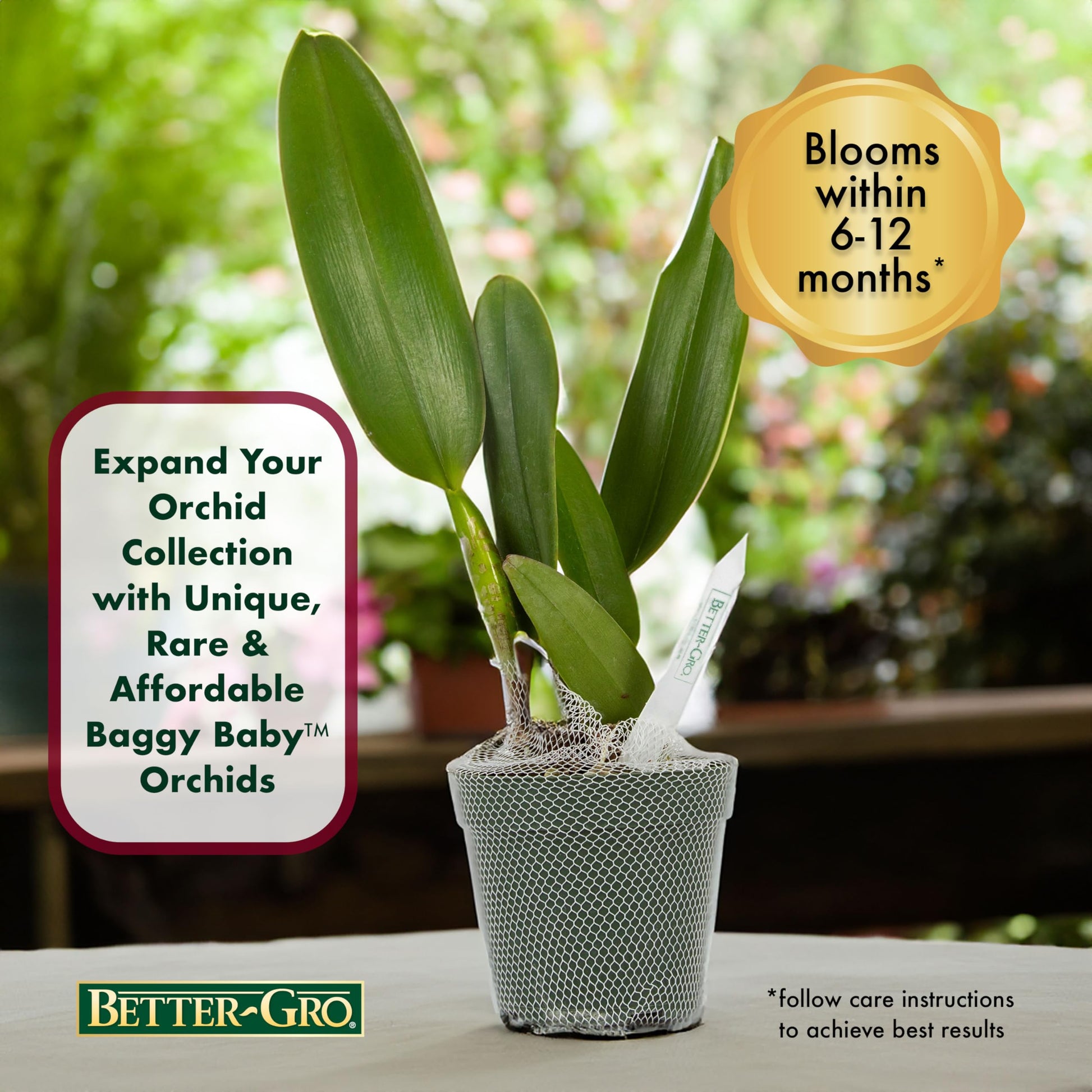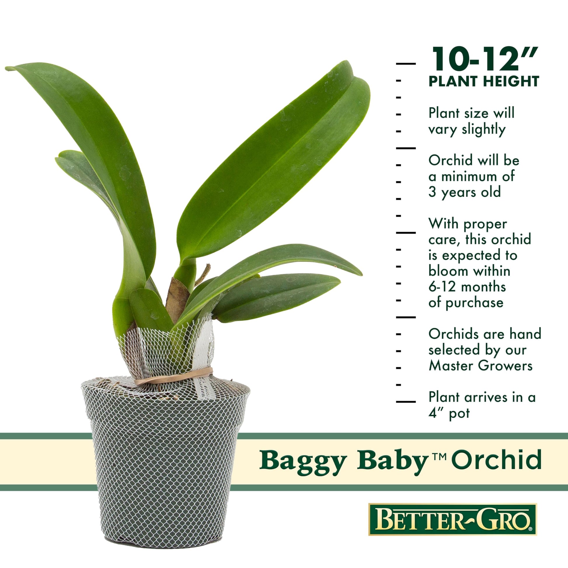 Introducing The Rare And Unique Better-Gro Baggy Babytm Cattleya Hybrid Orchid, A Stunning Addition To Any Indoor Or Outdoor Orchid Collection. This Cattleya Hybrid Orchid Is Approximately 6-12 Months From Blooming. Blooms Will Be A Deep, Rich Burgundy Color Featuring A Beautiful Waterfall Lip With A Yellow/Orange Heart. Blooms Will Also Be An Enjoyable Floral Fragrance. This Cattleya Hybrid Orchid Is Sure To Create A Captivating Visual That Will Enhance Any Space. Cattleya Orchids Thrive In Bright, Indirect Light And Require A Well-Draining Orchid Potting Mix Such As The Better-Gro Special Orchid Mix. Water Thoroughly When The Top Inch Of The Potting Mix Feels Dry, But Avoid Letting The Plant Sit In Water To Prevent Root Rot. Maintain Moderate To High Humidity Levels And Provide Good Air Circulation To Ensure The Health Of Your Orchid. Fertilize Regularly (We Recommend Alternating The Use Of Better-Gro Orchid Plus And Better-Gro Better Bloom Plant Foods To Support Growth And Vibrant Blooms. This Orchid Is Hand-Selected By Master Orchid Growers To Ensure That You Receive A High-Quality Plant That Is On Its Way To Blooming. The 4-Inch Plant Is Over Three Years Old And Will Take 6-12 Months To Reach Blooming Size, Offering An Excellent Value Compared To Potted Blooming Orchids. Enjoy The Entire Blooming Cycle And Watch As Your Cattleya Orchid Transforms Your Home Or Office With Its Elegant Beauty. For Optimal Care, Keep The Orchid At Temperatures Between 55-85 Degrees Fahrenheit And Remove Spent Flowers To Encourage New Growth. Repot Every 1-2 Years With Fresh Potting Mix. We Recommend Better-Gro Special Orchid Mix To Provide The Best Environment For Your Orchid To Thrive. Add This Better-Gro Cattleya Hybrid Orchid To Your Collection And Experience The Joy Of Nurturing And Witnessing Its Stunning Blooms And Plant Life Cycle.
